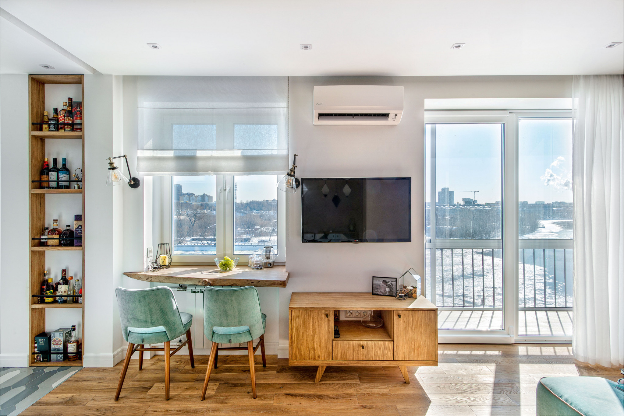 Лёгкие на подъём молодые супруги, занятые в сфере продаж и проводящие свободное время в путешествиях по миру, планировали вдохнуть жизнь в старую квартиру в кирпичном доме 1961 г. постройки, расположенного на Дербенёвской набережной. Для общительной пары требовалось организовать единое пространство кухни-гостиной-столовой, но при перепланировке пришлось учитывать, что зона готовки газифицирована и её нельзя объединять с остальными помещениями. А вот для организации спальни, в которой энергичные заказчики не планировали проводить много времени, можно было обойтись минимумом квадратных метров. Среди особых пожеланий — оборудовать места для хранения, не задействуя при этом площадь балкона, который изначально решили полностью остеклить, чтобы тем самым включить в жилище живописные виды на реку.
