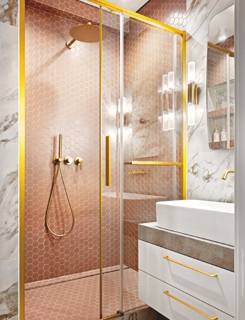 При обустройстве ванной комнаты дизайнеру пришлось учесть множество нюансов, включая поиск плиточника. От мастера по укладке потребовалось ювелирное мастерство при стыковке шестигранной плитки с обычной