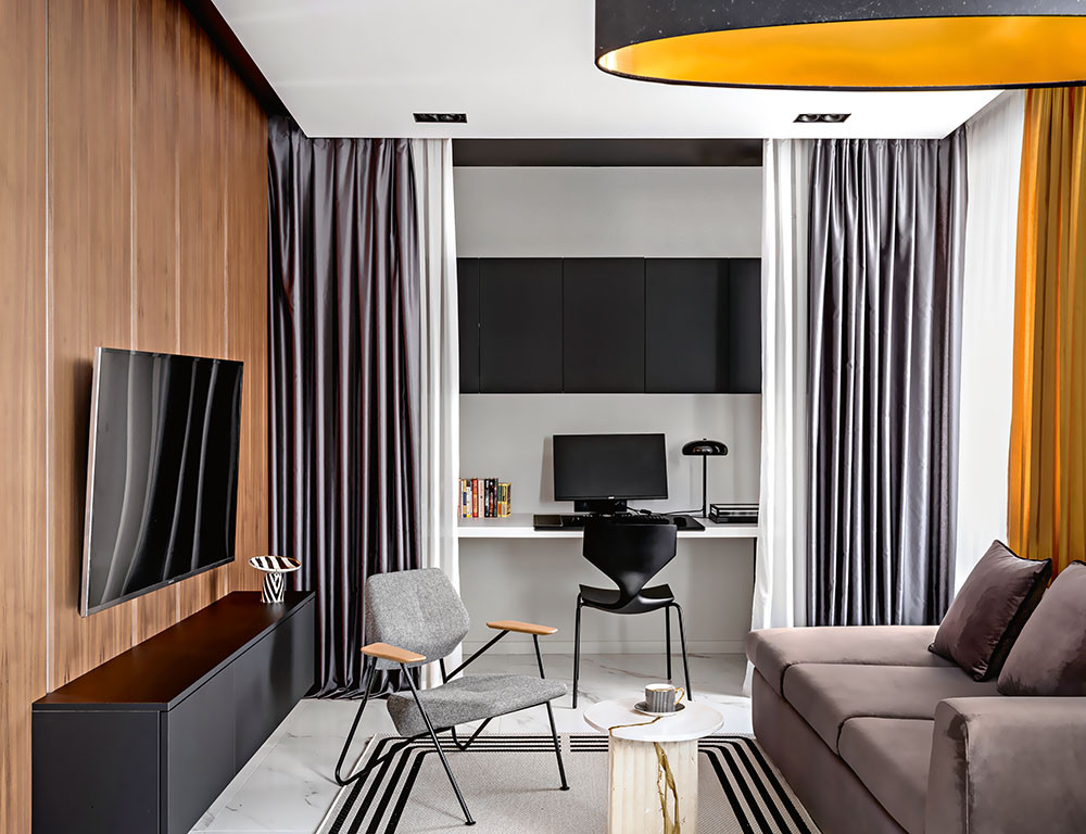 Квартира в Московской области создавалась для творческой пары, работающей в сфере кинематографа. Супруги любят путешествовать, восторгаются итальянским искусством и русскими художниками. В интерьерах им нравятся контрасты, ритмичность и яркие акценты. Свои пожелания дизайнеру они сформулировали так: стильное пространство вне времени, которое будет актуальным и спустя несколько лет, сдержанное по цвету, но с акцентом на тёплый жёлтый (охру). Главной задачей ставился продуманный домашний офис, который можно было бы спрятать, с двумя рабочими местами. Ещё требовались места для хранения, туалетный столик, глубокий подоконник, чтобы любоваться красивыми закатами.