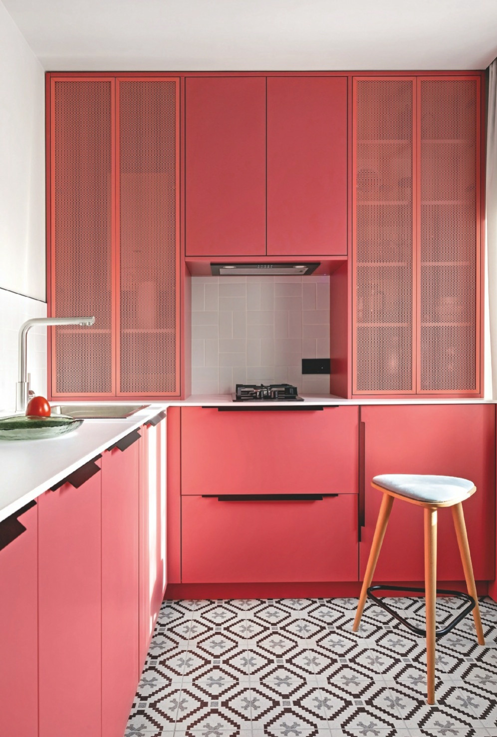 Квартира в Калининграде оформлялась для сдачи в краткосрочную аренду, и заказчице хотелось, чтоб она выгодно отличалась от привычных бежевых интерьеров. Я предложила создать лёгкий интерьер-эмоцию в эклектичном стиле со множеством интересных деталей. Кухня по цвету самая яркая в квартире. Тёплая гамма в амплитуде от кораллового до терракотового с добавлением охлаждающего мятного и яркого арбузного создаёт настроение праздника. Фартук в сочетании с белой столешницей оттеняет яркий цвет, плитка на полу напоминает старинный герб Кёнигсберга, арт на стене всё объединяет. Ироничный арт с дамами в купальниках (подруги, наслаждающиеся отдыхом на Балтийском побережье) отрисован по моим эскизам и напечатан в типографии.