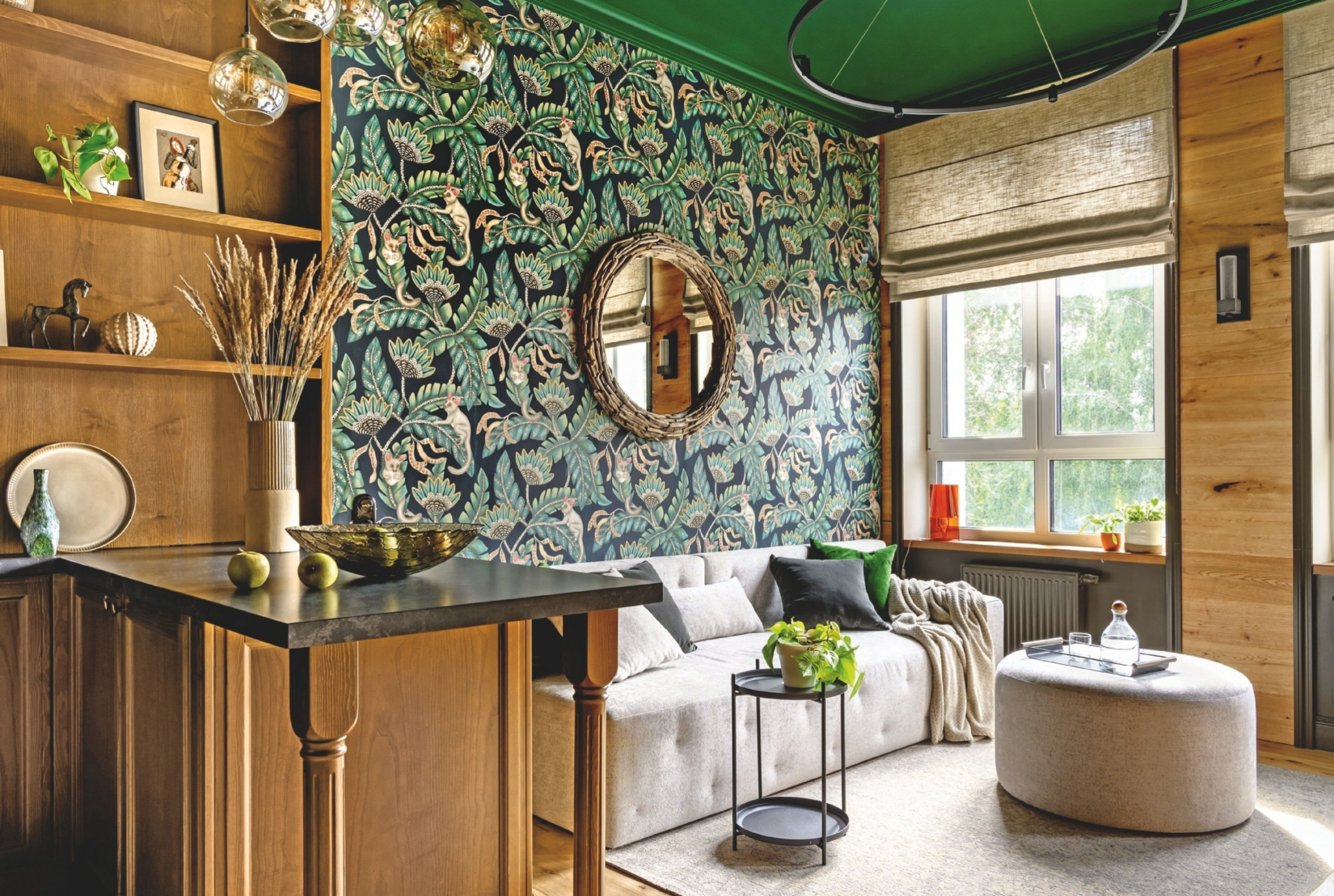 Цветовое решение строится на глубоком матовом тёмно-зелёном в мебели, на стенах и потолке. Его насыщенность подчёркивается природной теплотой рыже-коричневого дерева в отделке и предметах интерьера. Лаконичные чёрные светильники создают контраст, а детали из латуни и бронзы вносят утончённую нарядность
