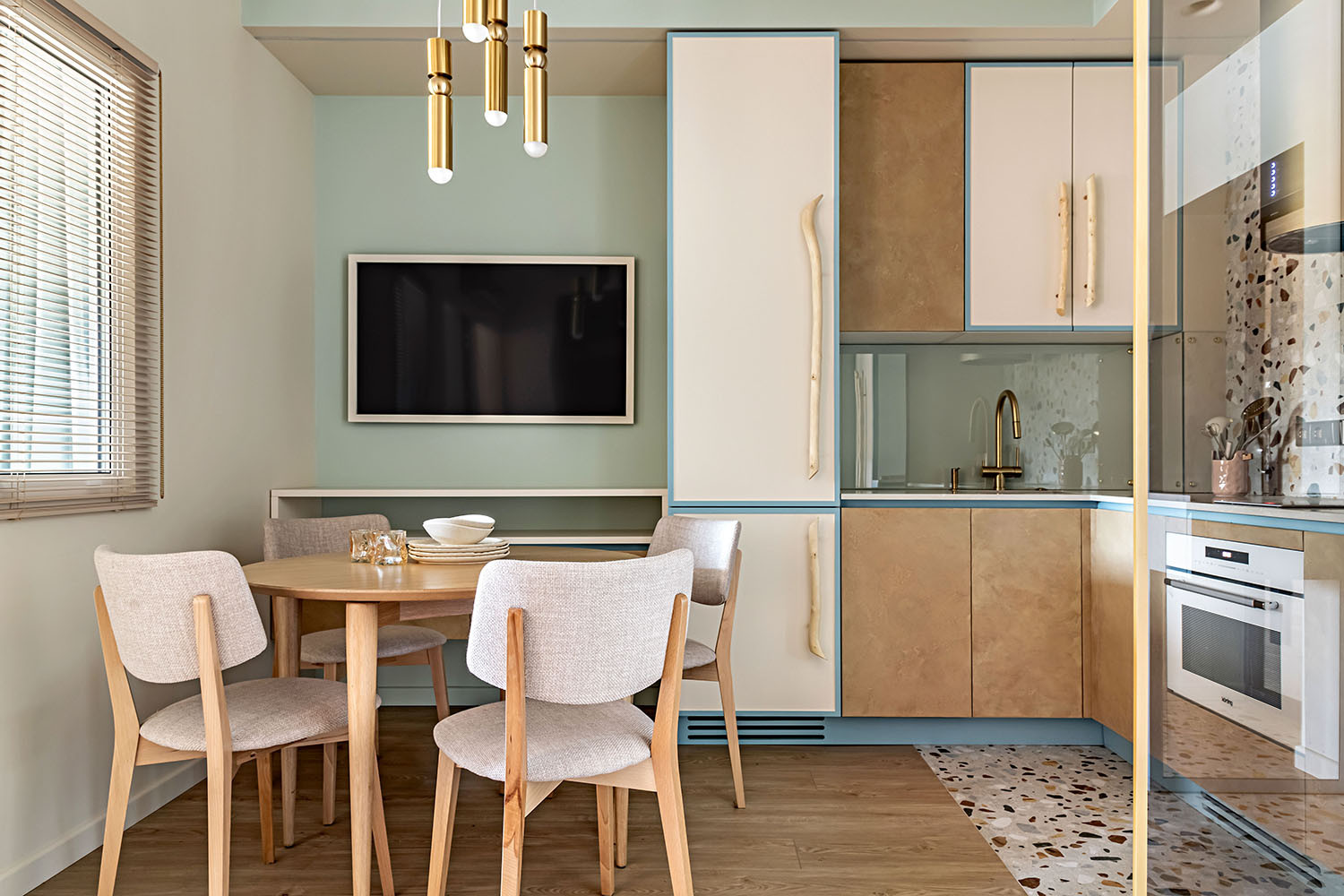 Заказчики — семья с двумя детьми школьного возраста — планировали проводить в этой подмосковной квартире выходные и праздники. Отправной точкой при создании интерьера стала фотография c отпуска на Мальдивских островах, которую клиенты прислали как эмоциональный референс будущей квартиры. Из окон открывается прекрасный вид на реку, поэтому лейтмотивом интерьера стала тема природы.