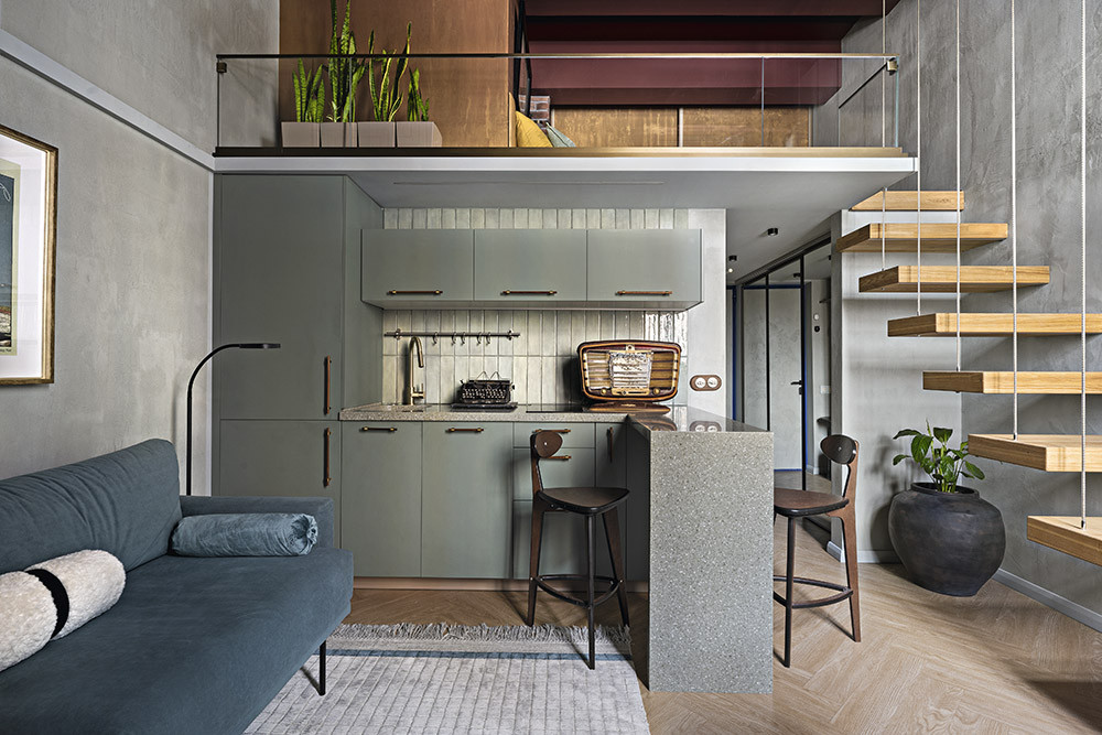 Апартаменты в здании бывшего НИИ радиосвязи в Москве площадью всего 21 м² привлекли заказчицу локацией и высокими потолками 4,2 м, позволяющими построить антресоль. Таким образом, получалось не просто увеличить площадь, а создать необычное пространство. Заказчица — активная пенсионерка, увлечённая историей и культурой столицы, поэтому квартиру ей хотелось обустроить с привязкой к прошлому этого старого, добротного здания, но стильно и по современным канонам.