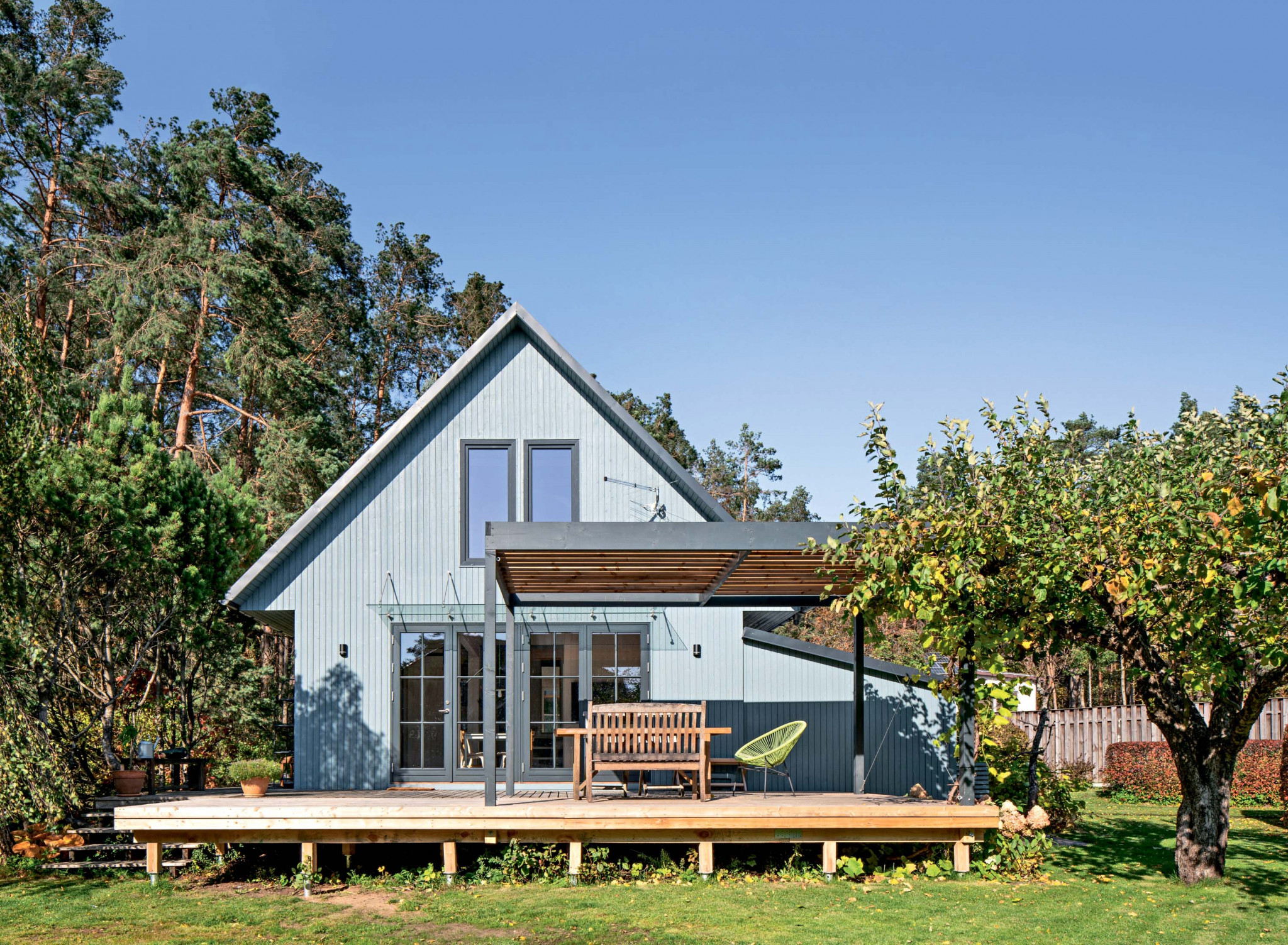 Архитектор предложил объединить тесные комнаты первого этажа в одно пространство и впустить в него как можно больше дневного света, а изолированными оставить только санузел и небольшую кладовую рядом с кухней. Более рациональная планировка мансарды дала возможность обустроить в ней ещё одну маленькую спальню для гостей. Строительные работы начали с изменения количества, размеров и расположения окон. Некоторые из них превратились в стеклянные двери. Появилось функционально узкое горизонтальное окно с форточкой у рабочей столешницы кухни. Фасад дома утеплили плитами минеральной изоляции. В качестве финишного слоя использовали классическую деревянную вагонку. Её вертикальное расположение придало внешнему виду домика бÓльшую элегантность. Вагонку покрыли краской, которая надёжно защищает дерево от УФ-лучей, влаги и грибка. Серо-голубой цвет, повторяющий цвет прежнего фасада, выделяет строение на открытом и хорошо освещённом участке.
