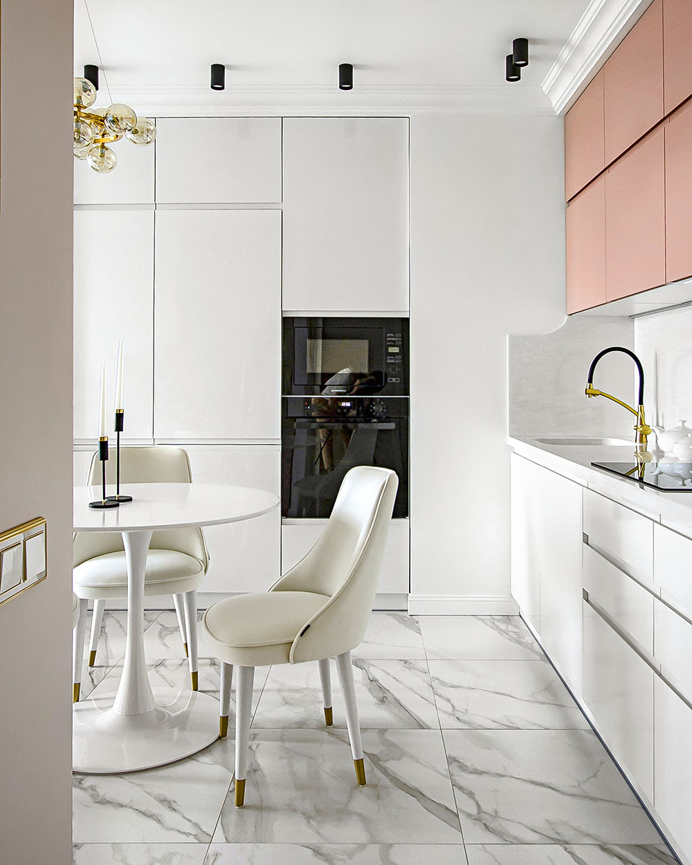 Лёгкость, воздушность интерьера подчёркивает контрастно-тёмная фактурная графика. С этой ролью отлично справляются тонкие металлические рамы перегородок, светильники и настенный декор. «Золотые» элементы звучат в обстановке драгоценными нотками