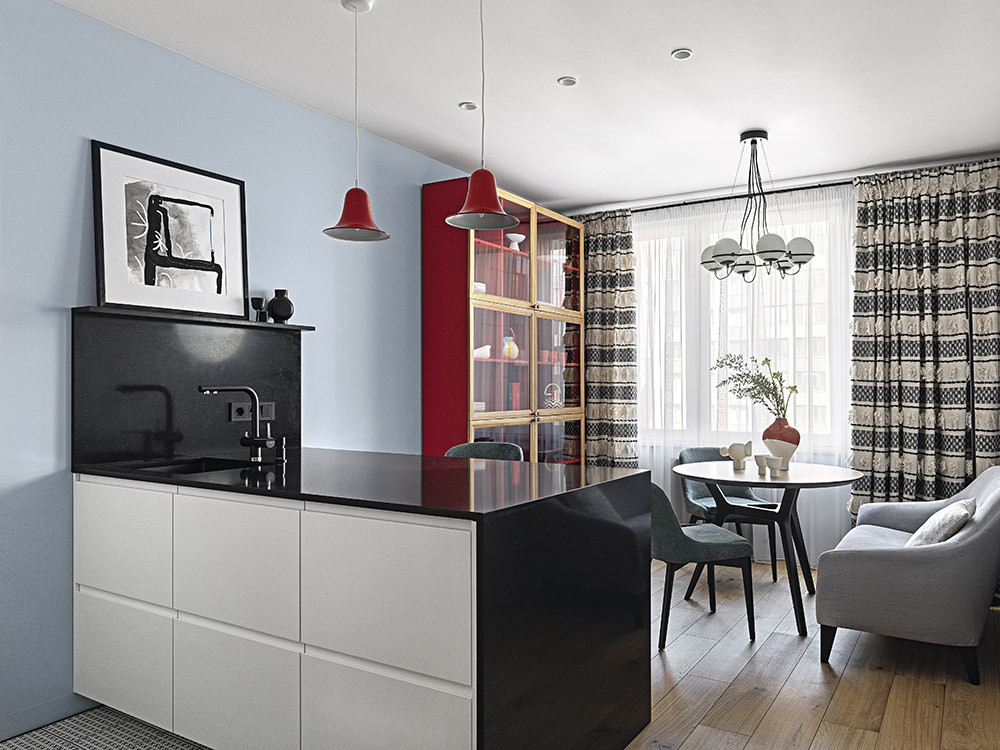 Двухкомнатная квартира находится в современном ЖК «Life Лесная» в Санкт-Петербурге. В ней живёт её владелец, молодой человек. Интерьер можно было бы назвать сдержанным, если бы не красные акценты, которые добавляют ему эмоциональности