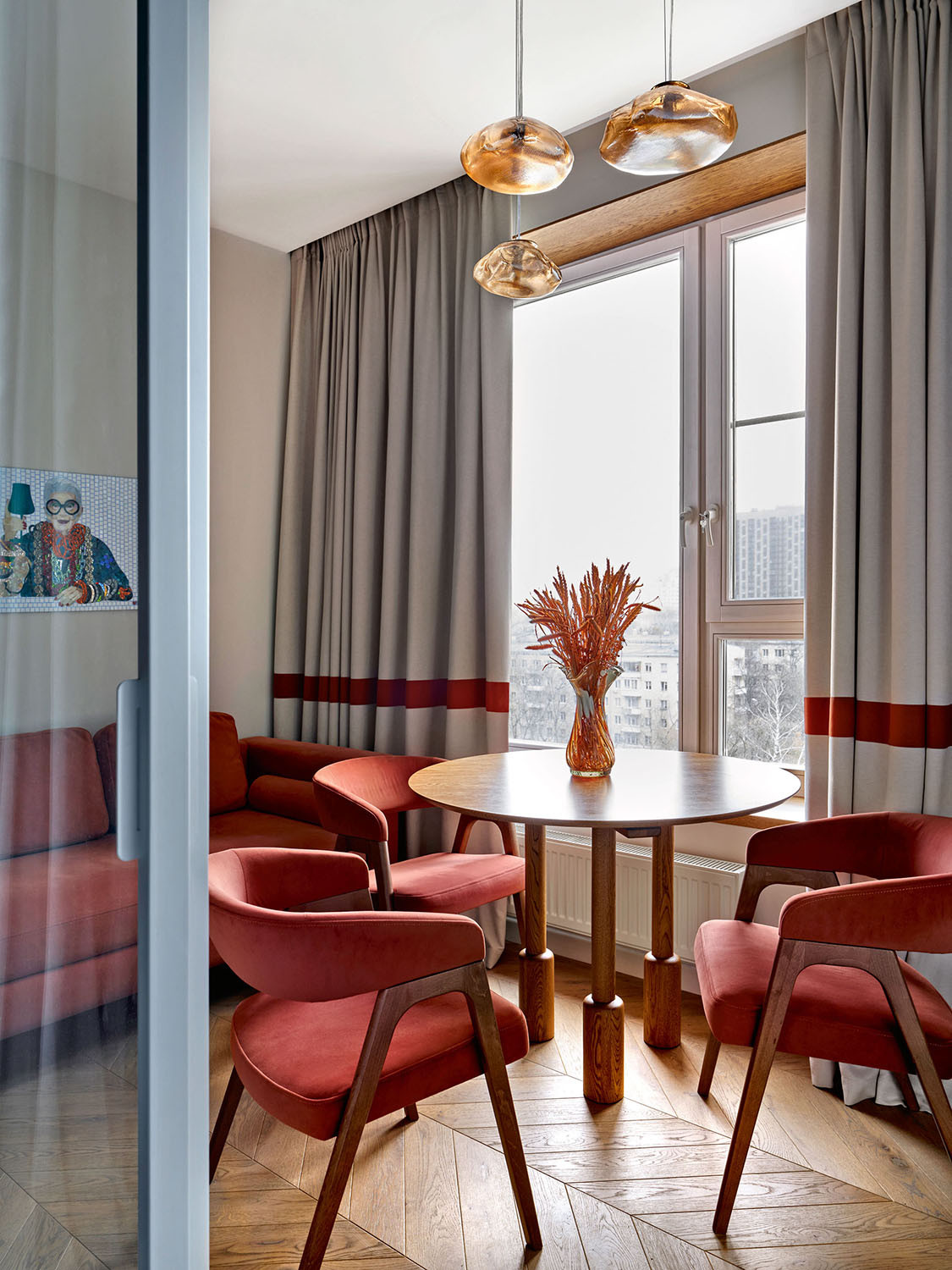 Благодаря выделению отдельных функциональных зон небольшая квартира не производит впечатления маленького пространства. А смелые, жизнерадостные цвета отделки соответствуют характерам домочадцев: мамы, дизайнера интерьера и автора этого проекта, и двух её сыновей. Отражением творческой составляющей их личностей и акцентом интерьера служит мозаичное панно с известной иконой стиля и дизайнером интерьеров Айрис Апфель.