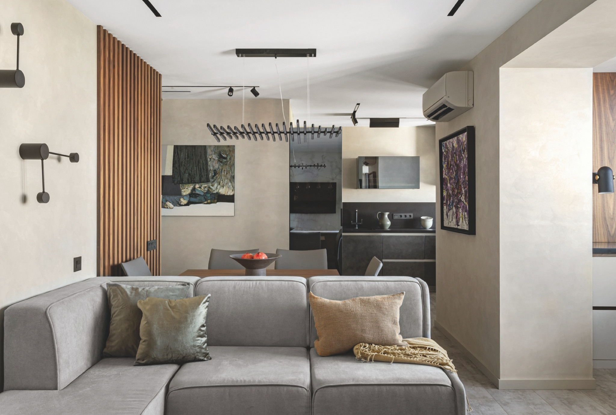 Чаще всего заказчик наведывается в столицу без членов семьи, но пару-тройку раз в год они приезжают все вместе, поэтому пространство требовалось организовать с учётом таких ситуаций. Несмотря на скромный размер квартиры — после перепланировки получилось чуть больше 55 м2 , — удалось выделить место для отдыха каждого члена семьи и организовать пространство для хранения.