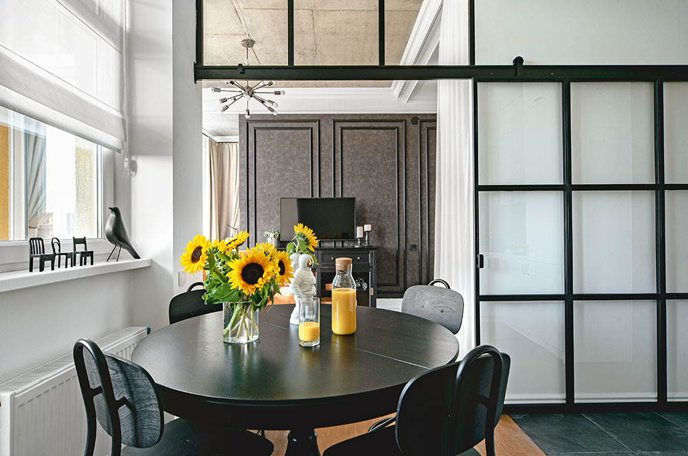 Перепланировка. Внутри квартиры не было капитальных конструкций, только ненесущие стены, что упрощало манипуляции с пространством. Однако инженерия объекта предполагала использование газового оборудования — плиты и водонагревателя, что ограничивало возможности перепланировки. Чтобы рациональнее распорядиться имеющимися квадратными метрами, дизайнер предложила перенести проход в жилое помещение. В результате рассчитанный на одну створку дверной проём превратился в широкую откатную конструкцию, ставшую частью перегородки между кухней-столовой и гостиной-спальней. Опосредованно это решение повлияло и на организацию прихожей. Её площадь уменьшили в пользу отдельной гардеробной; вход в помещение, предназначенное для хранения вещей, предусмотрели со стороны спальни. Зона кухни и санузел (в данном случае предпочтение отдали традиционной ванной комнате) остались в исходных границах. Лоджию было решено оставить без изменений — тёплый климат позволял обустроить в ней открытую сезонную зону отдыха.