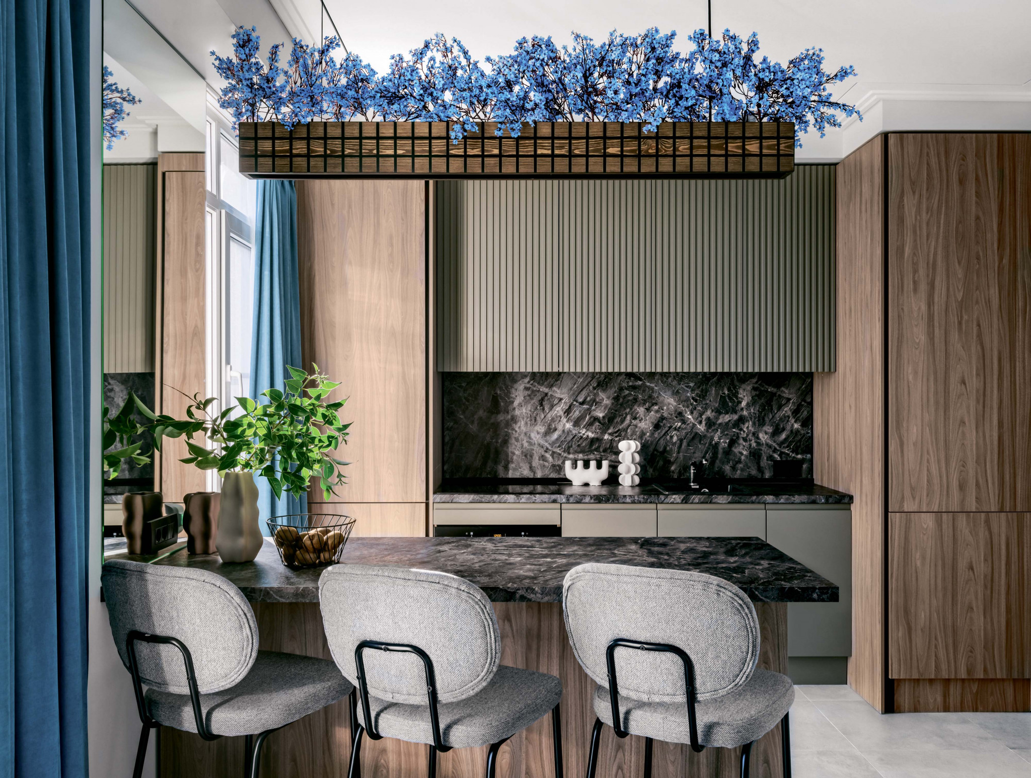 Синие оттенки в декоре спальни, располагающие к отдыху и спокойствию, разбавлены древесными тонами. Реечное панно примыкает к изголовью кровати, переходит на дверь и заканчивается у шкафа, словно растворяясь в пространстве