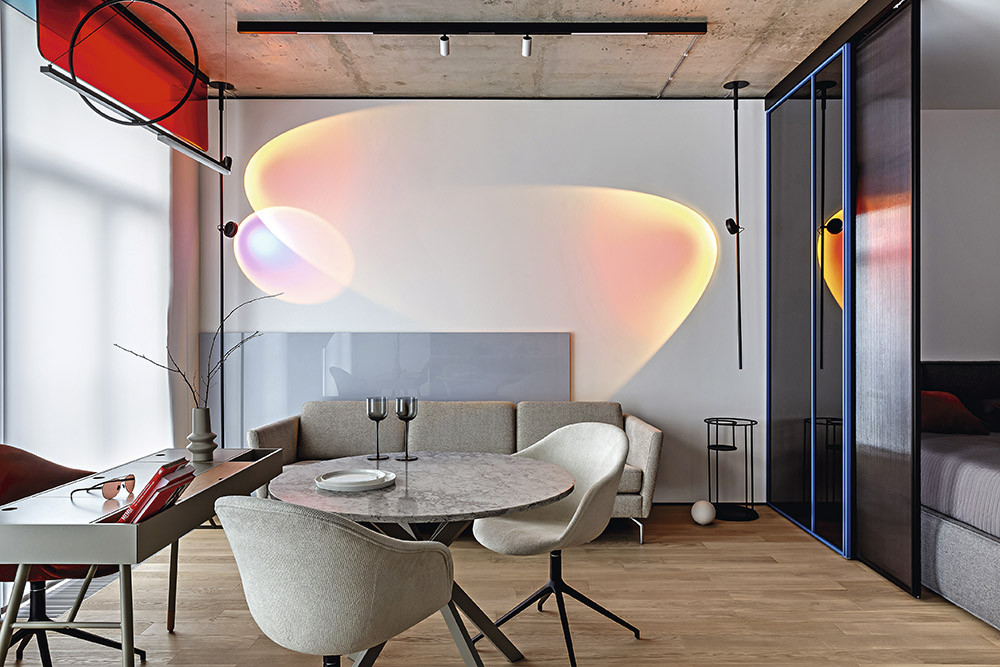 Заказчику импонирует минимализм, он любит живопись Василия Кандинского, а в цветовой палитре ему больше всего нравится синий и его оттенки. Так появился этот интересный, яркий и полный воздуха интерьер с множеством авторских разработок. Планировка. Квартира досталась от застройщика «в бетоне»: пространство без перегородок, даже зона санузла не была выделена. Только группа стояков с коммуникациями делила пространство на две части. С чистого листа дизайнеры создали санузел сложной формы, так чтобы поместились шкафы со стороны прихожей. Выделили зону спальни, отделив её секцией с лавочкой со стороны входной зоны и шторой. Спальню и гостиную зонировали раздвижными стеклянными перегородками. Кухня-гостиная и рабочая зона в проекте объединены.