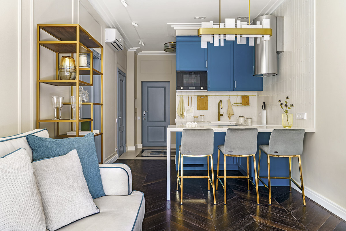 Стильный интерьер построен на предпочтениях владельцев квартиры, которые время от времени приезжают отдохнуть в культурную столицу. В противовес обычно пасмурным и серым пейзажам Петербурга пространство оформлено в цветах солнечного морского побережья. Синие и голубые оттенки, приятный глазу молочно-бежевый и яркие золото и латунь настраивают на позитив.