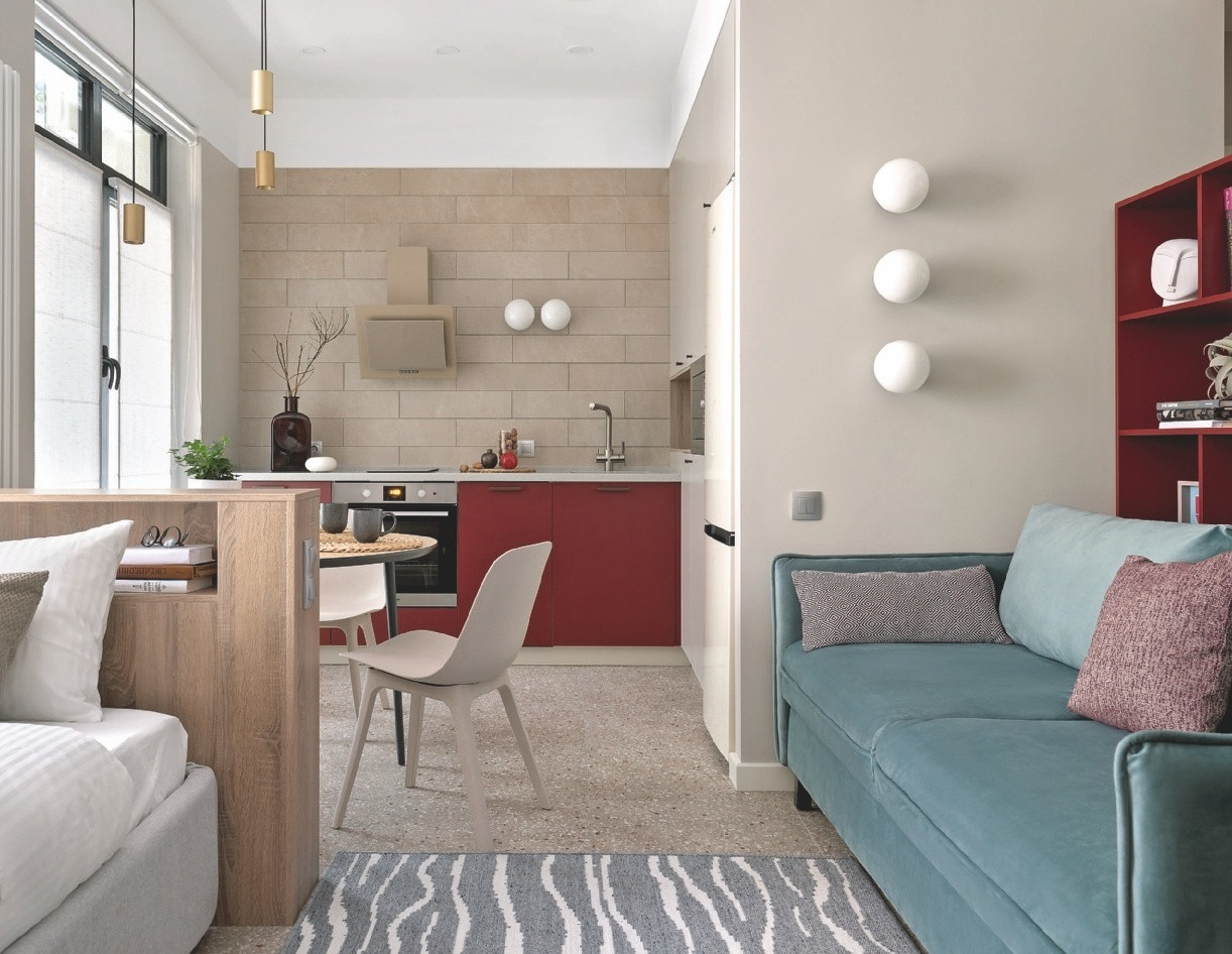 Апартаменты в престижном столичном районе приобретались для сдачи в аренду; целью хозяйки был максимальный комфорт будущих жильцов. Поэтому от исходного планировочного решения с отдельными кухней и комнатой отказались в пользу студийной организации пространства. Теперь основные зоны имеют исключительно визуальные границы, а единственное изолированное помещение — это санузел.