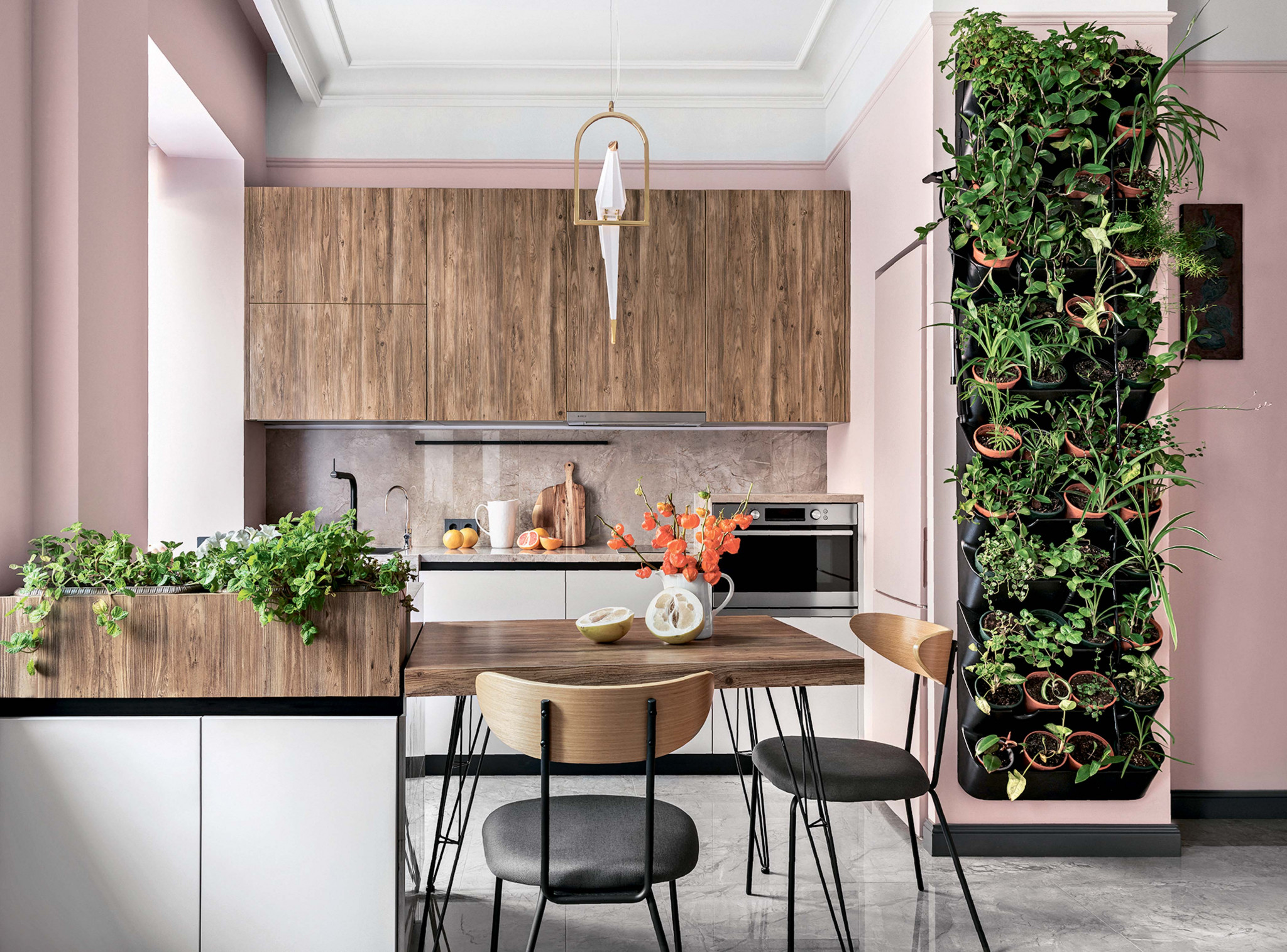 Перепланировка. Изначально в квартире имелись две жилые комнаты, крохотная кухня, ванная, туалет и прихожая. Кухню объединили с гостиной, согласовав отключение газа. (По действующим нормам кухня с газовой плитой должна быть изолирована от жилых помещений.) Дверь в спальню перенесли из прихожей в гостиную, подальше от входной зоны. Освободившееся пространство позволило разместить в прихожей встроенный шкаф. На месте туалета организовали кладовую, где поставили стиральную машину, организовали нишу под встроенный холодильник в кухне, разместили оборудование для зелёной стены. Всю необходимую сантехнику установили в бывшей ванной комнате. Перенос унитаза на 1,5 м от канализационного стояка допускается с соблюдением уклона трубы. Другой вариант — подключение канализационной установки с принудительной циркуляцией. Оборудование имеет компактные размеры, однако требует обслуживания, поэтому остановились на первом варианте с самотёком, как более простом.