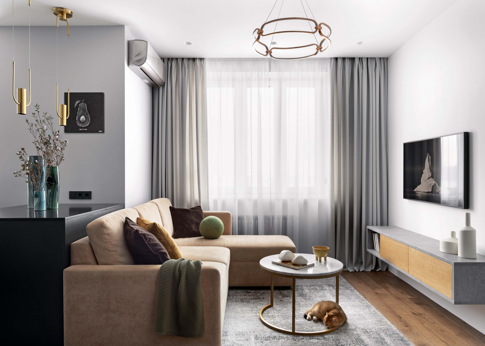 Интерьер интересен тем, насколько образно, старательно и бережно по отношению к бюджету заказчиков реализован минимализм в современной новостройке. Неважно, что золото в деталях не настоящее, косточка авокадо на стене не из серебра, а диван отечественного производства, без премиального лоска. Формы и цвета подобраны и расставлены мастерски, с глубоким знанием дела.