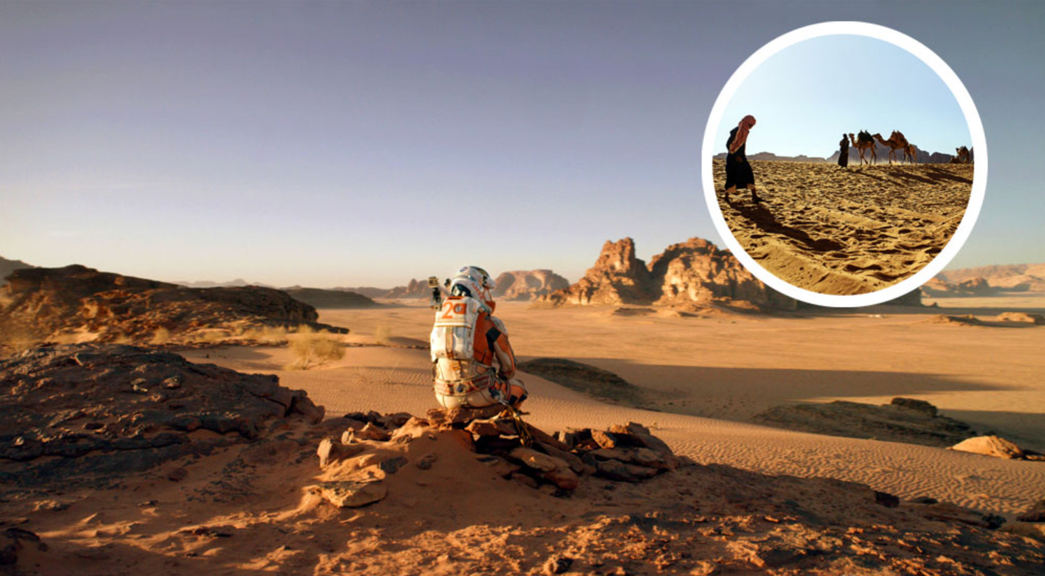 Иорданская пустыня Вади-Рам — одно из самых кинематографичных мест на Земле. Со времен «Лоуренса Аравийского» ее снимали в добром десятке фильмов, причем несколько раз в роли Марса («Красная планета», «Последние дни на Марсе»). Выжженные солнцем равнины и песчаные горы, в том числе самые высокие в Иордании Джабаль-Умм-ад-Дами (1854 м) и Джабаль-Рам (1734 м), вполне соответствуют представлениям зрителей о марсианском пейзаже.