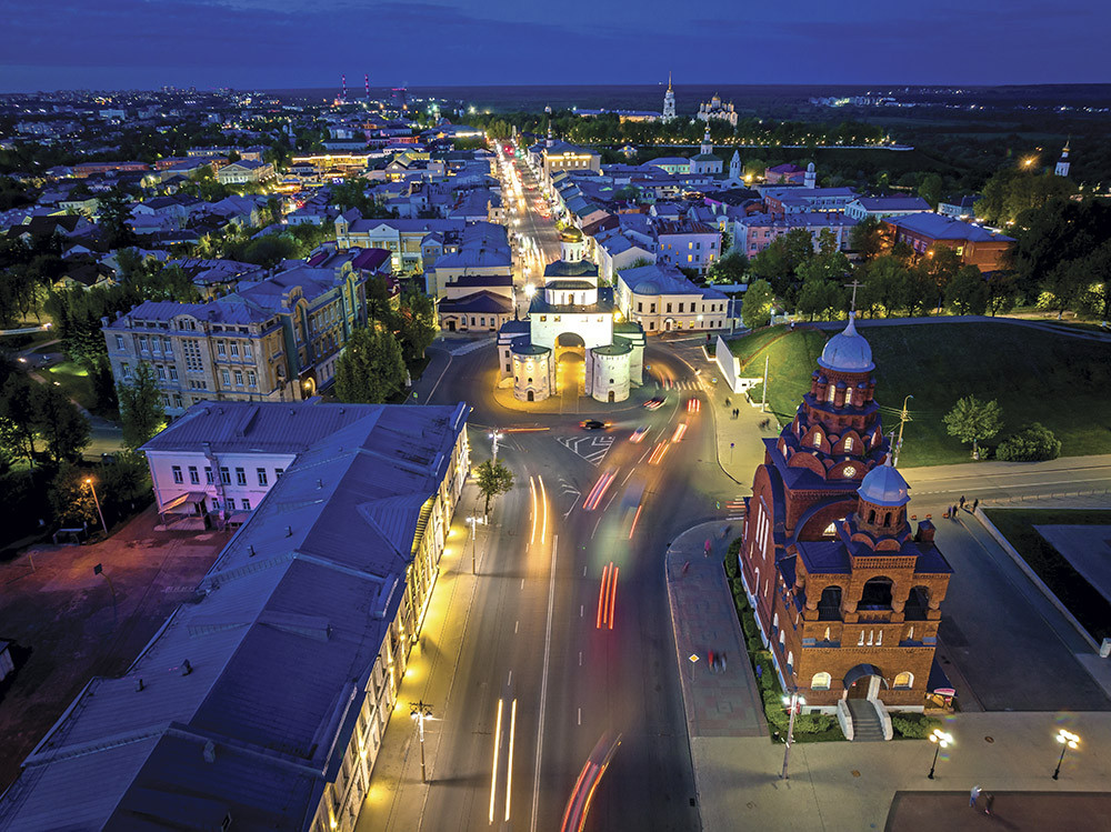 Владимир около 200 лет был столицей Древней Руси. Ввиду особой значимости город был окружен мощными крепостными стенами с парадным входом – Золотыми воротами. Подобные арки были еще в Константинополе, Иерусалиме, Киеве. Но в хорошем состоянии, практически в неизменном виде, до нас до шли только Владимирские врата. Они уже девять столетий встречают гостей города на въезде со стороны Москвы. Наверху белокаменного сооружения есть смотровая площадка, а внутри – звуковая диорама «Штурм Владимира ханом Батыем». Посмотрели? Проходите – не задерживайтесь, милости просим. И готовьте икроножные мышцы к активной работе: исторический центр города стоит на девяти холмах, так что его изучение потребуют от вас определенной физнагрузки. Зато гористый рельеф подарит вам незаурядные ракурсы – усилия точно будут вознаграждены.