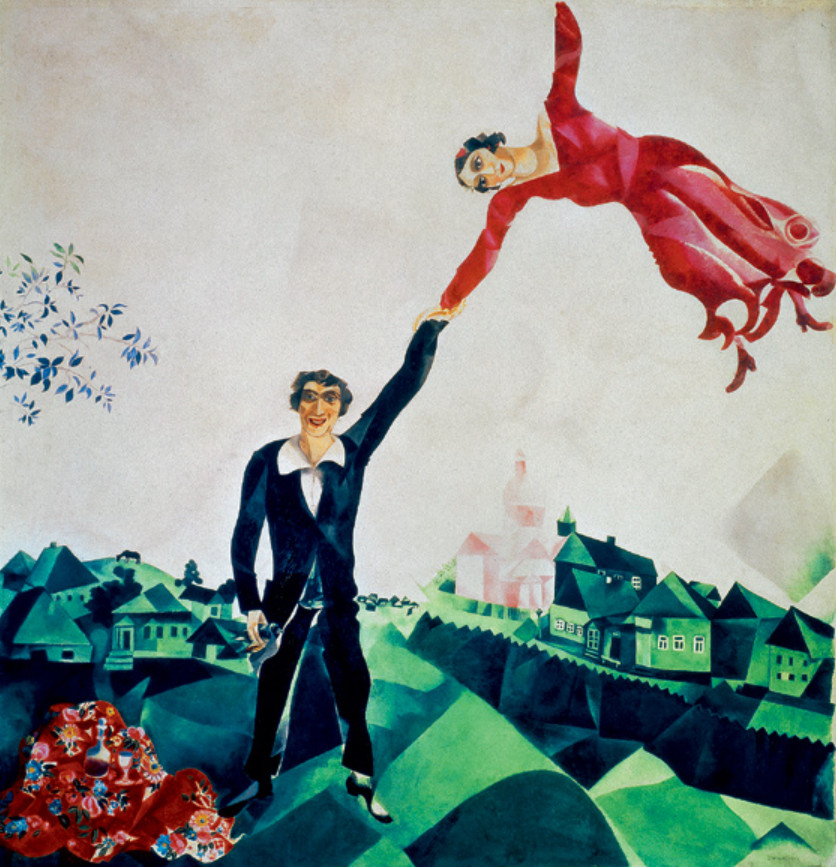 «Человеком воздуха» («люфтменч» на идише) называют того, кто полон идей, далеких от реальности. Но Шагал, который любил изображать персонажей своих картин летящими, придает оторванности от земли другой смысл. «Чтобы взлететь, — утверждал художник, — мало мечтательности, нужен темперамент, восторг, теснящий грудь, страсть, поднимающая в воздух». Шагал показывает чувства как физические действия: героиня «Прогулки» летит, окрыленная любовью и счастьем.