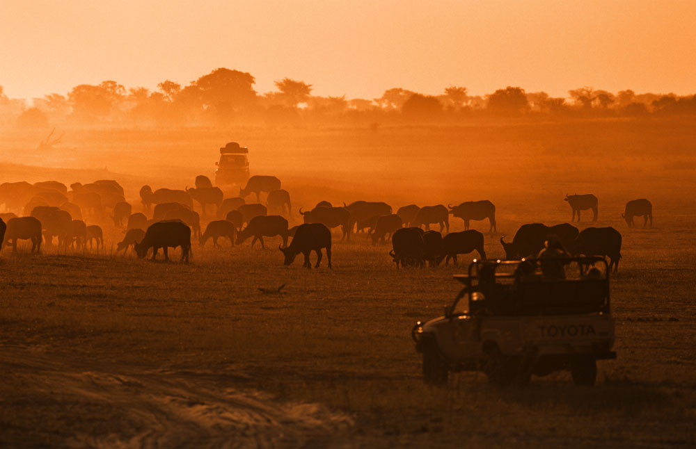 Слон — опасное и агрессивное животное. И одно из главных условий во время сафари — быть готовым к неожиданностям. Тем не менее сейчас мы не рисковали. Судя по вырванным кустам, слоны сыты, то есть довольны и спокойны. Мою догадку подтвердили приподнятые хоботы: значит, слоны пытаются поймать ветер, чтобы лучше нас унюхать. У них широко раскрыты глаза и слегка задраны вверх головы: слоны хотят разглядеть «пришельцев».