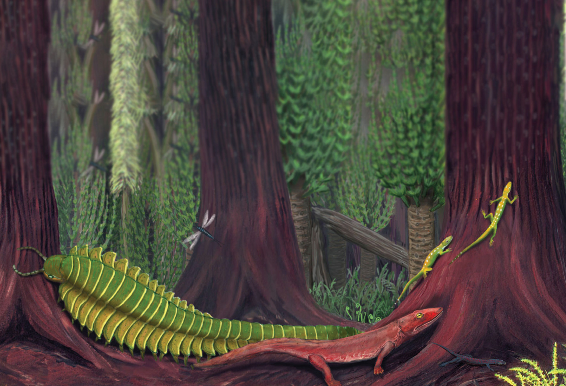 Реконструкция флоры и фауны формации Джоггинс, выполненная Брайаном Чу: гигантская многоножка артроплевра, примитивные крылатые насекомые,похожие на стрекоз, убегающие от дендрерпетона гилономусы и азафестера; на заднем плане нас встречают каламиты – древние хвощи