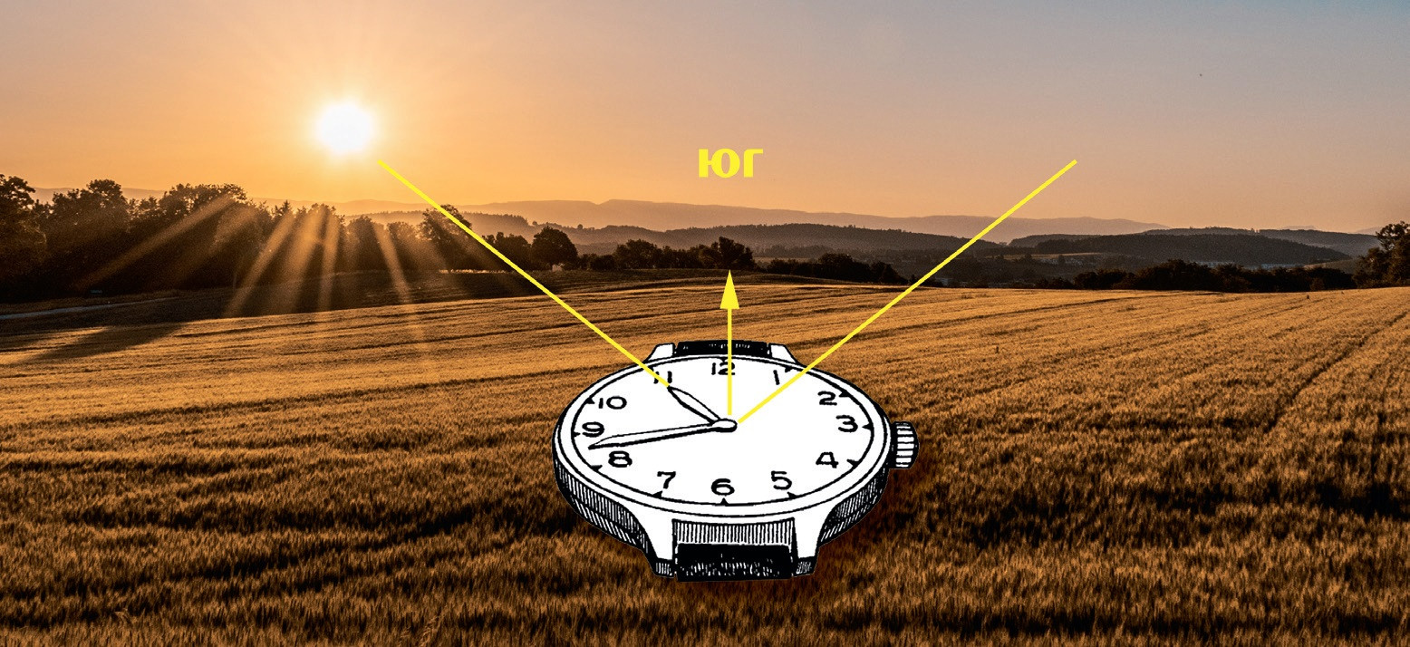 Полдень (12 часов дня) по местному солнечному времени наступает, когда наше светило будет находиться в наивысшей точке на небе, кульминирует, как говорят астрономы. В этот момент для наблюдателя в средних широтах Северного полушария Земли Солнце будет строго на юге. Данный факт используется для нахождения сторон света по солнечным часам. В полдень наблюдается самая короткая тень, причём направленная строго на север. Оговорка про Северное полушарие не случайна. Для наблюдателя в средних широтах Южного полушария Солнце будет находиться, наоборот, на севере. Если стрелочные часы показывают местное солнечное время, то для определения направления на юг надо расположить их горизонтально так, чтобы часовая стрелка была направлена по азимуту Солнца (не следует понимать буквально слова стихотворения, что стрелку надо направить на Солнце). После этого нужно поделить пополам угол между ним и азимутом числа 12 на циферблате. Направление биссектрисы и покажет юг. Если у вас часы электронные, можно просто нарисовать стрелочные часы с текущим временем на листке бумаги.