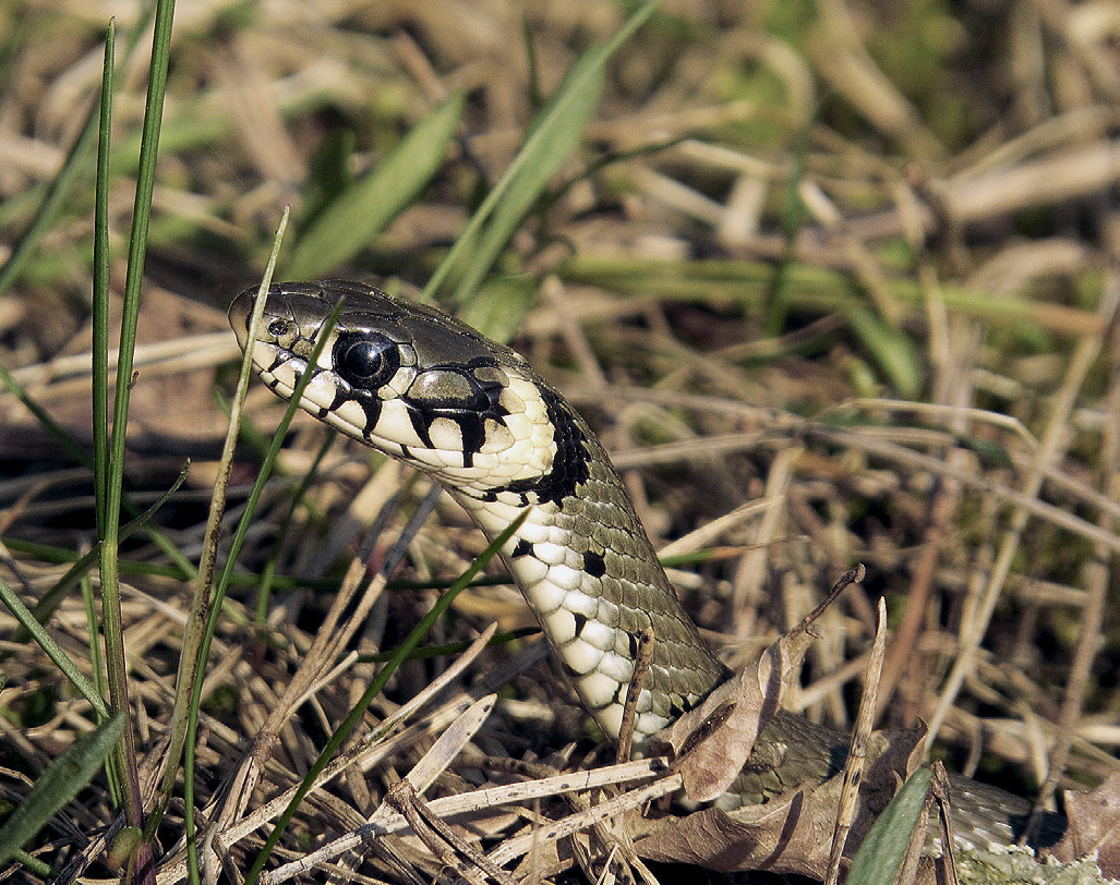 О, да мы тут не одни! На краю ямки из-под нависших корней, образовавших своего рода маленькую пещерку, выглядывал другой уж, а позади него в темноте виднелась новая пара жёлтых пятен… Хвосты ужей были плотно переплетены. Присмотревшись, я обнаружил вокруг ещё несколько представителей того же семейства. Все они тихонько ползали туда-сюда.
