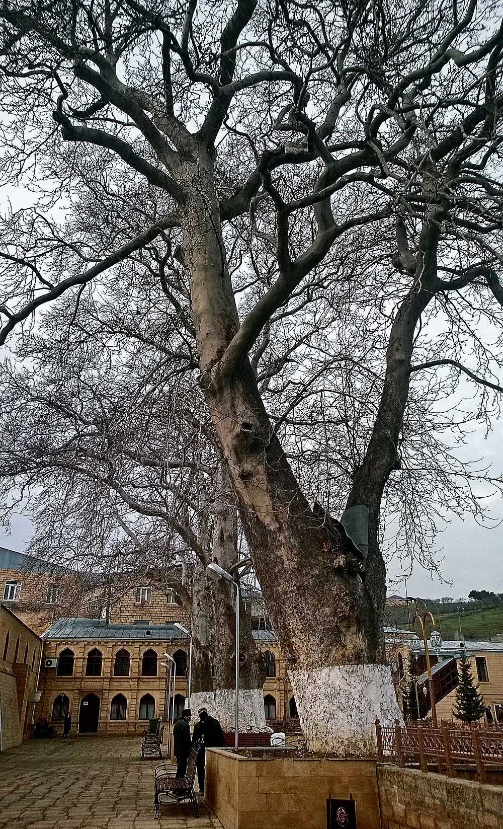 Расположенная в Дербенте Джума-мечеть — старейшая на территории России и одна из древнейших в мире: она основана в VIII веке! Как и у многих других старинных мечетей, комплекс её построек (сама мечеть, медресе и другие сооружения) образует внутренний двор. И в нём находится невероятное сокровище — пять огромных платанов. Высота их достигает 40 м, а диаметры стволов — почти 2 м. Они настолько велики, что по ним расположение мечети видно из любой части города. Возраст деревьев достигает 800—900 лет, а по другим оценкам, может превышать 1000 лет (что, заметим, для платанов не редкость — в Средиземноморье встречаются деревья возрастом более 2000 лет). Прекрасная сохранность платанов, как и высадка в своё время именно их во дворе мечети связаны с особым почитанием этого дерева. Фото Никиты Кадетова