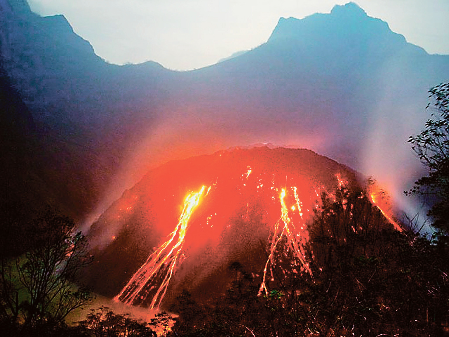 Извержение вулкана — это процесс излияния магмы и выброса вулканом раскалённых обломков и пепла. Магма, поднимаясь по каналу вулкана, выходит на поверхность и, потеряв большую часть летучих компонентов, становится лавой. Если магма имеет небольшую вязкость, она, вырываясь на поверхность, может образовывать лавовые фонтаны или изливаться потоками (такие извержения и лавовые потоки происходят достаточно часто на Гавайях и Камчатке). Если же магма становится густой из-за вулканической дегазации и кристаллизации магматического расплава (то есть её вязкость увеличивается), то, выдавливаясь из канала вулкана, она нагромождается в виде лавовых куполов, корка (или панцирь) которых достаточно толстая. Корка создаёт тепловую изоляцию для внутренних слоёв, которые могут месяцами оставаться горячими и текучими. Если часть лавового купола разрушается и обнажает лаву, находящуюся под большим давлением, происходят взрывы, обвалы, камнепады и выделения газа. Например, обрушение лавового купола на вулкане Монтань-Пеле (остров Мартиника) в 1902 году уничтожило город Сен-Пьер и унесло более 26 тысяч жизней. Обрушение купола может дать начало пирокластическому потоку, называемому ещё палящей тучей. Палящая туча — раскалённая смесь газов, пепла и обломков, скатывающаяся с высокой скоростью по склону вулкана, — один из самых опасных феноменов при извержении.