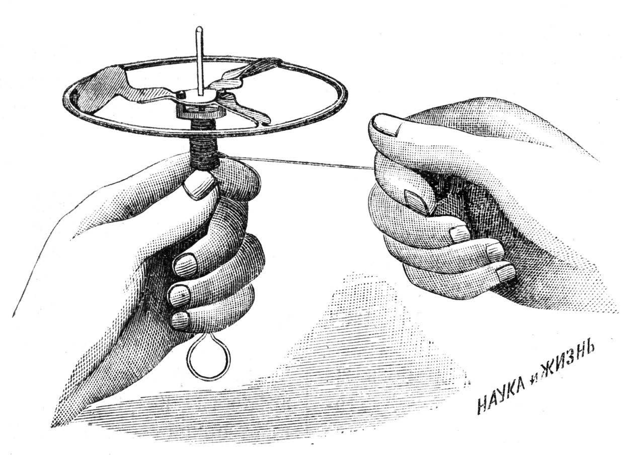 К тоненькой жестяной трубочке вверху припаиваются под прямым углом три жестяные же пластинки, наружные концы коих припаяны к кольцу из проволоки. Трубка надевается на проволоку, а на трубку наматывается конец нитки, как в обыкновенном волчке. Если сильно и быстро потянуть свободный конец нитки, то волчок будет быстро вращаться и высоко поднимется на воздух.