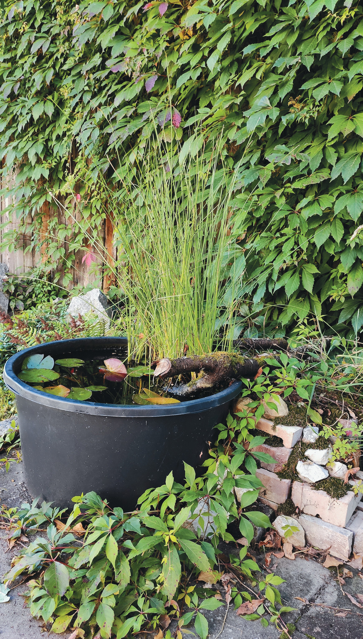 Наш миниатюрный пруд мы не стали вкапывать, а установили прямо на бетонную плитку на террасе. Дочь, которой тогда было около трёх лет, всё спрашивала: «Ну, когда уже на листиках появятся лягушата?» Я улыбалась и отвечала, что лягушата — это, конечно, было бы неплохо, но у нас тут рядом большой лес, недалеко течёт через поле река, кто же захочет жить в строительном тазу?