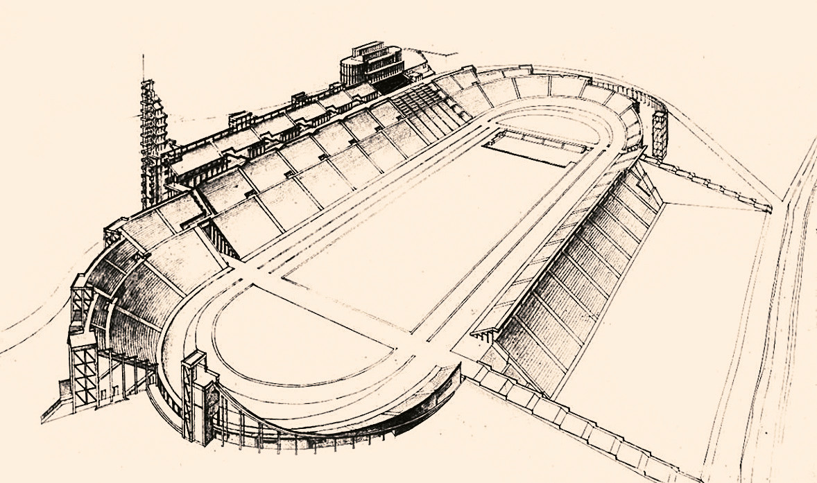 Несмотря на затруднительные экономические условия, постройка Всероссийского Красного стадиона, заложенного осенью прошлого года на Воробьёвых горах, успешно продвигается вперёд. Проект его показан на рисунке. Весной будущего года предполагается закончить дренажные работы, а также укрепление берега. Инженеры, стоящие во главе работ, категорически утверждают, что к июню спортивная площадка будет вполне готова для больших состязаний. К этому времени предполагается дать ей лёгкую утрамбовку (зелёного поля, вероятно, ещё не будет) и построить временные трибуны. Таким образом, предполагаемая Всероссийская олимпиада будет разыграна на Воробьёвых горах.