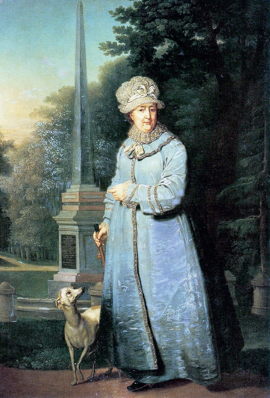 «На другой день рано утром Марья Ивановна проснулась, оделась и тихонько пошла в сад. <...> Марья Ивановна пошла около прекрасного луга, где только что поставлен был памятник в честь недавних побед графа Петра Александровича Румянцева. Вдруг белая собачка английской породы залаяла и побежала ей навстречу. Марья Ивановна испугалась и остановилась. В эту самую минуту раздался приятный женский голос: “Не бойтесь, она не укусит”. И Марья Ивановна увидела даму, сидевшую на скамейке противу памятника». (Повесть А. С. Пушкина «Капитанская дочка».)