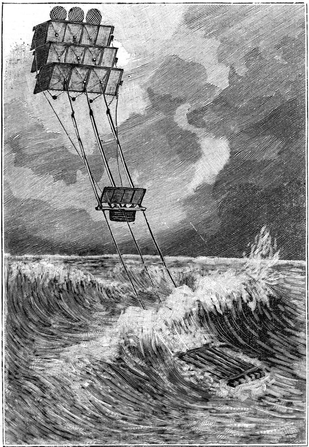 Три толстые веревки идут от системы змеев вниз. На нашей гравюре нижние концы веревок прикреплены к плоту из бревен. В случае, если путешествие совершается по суше, то нижние концы прикрепляются к большой телеге, которая катится по земле, вслед за путешественником.