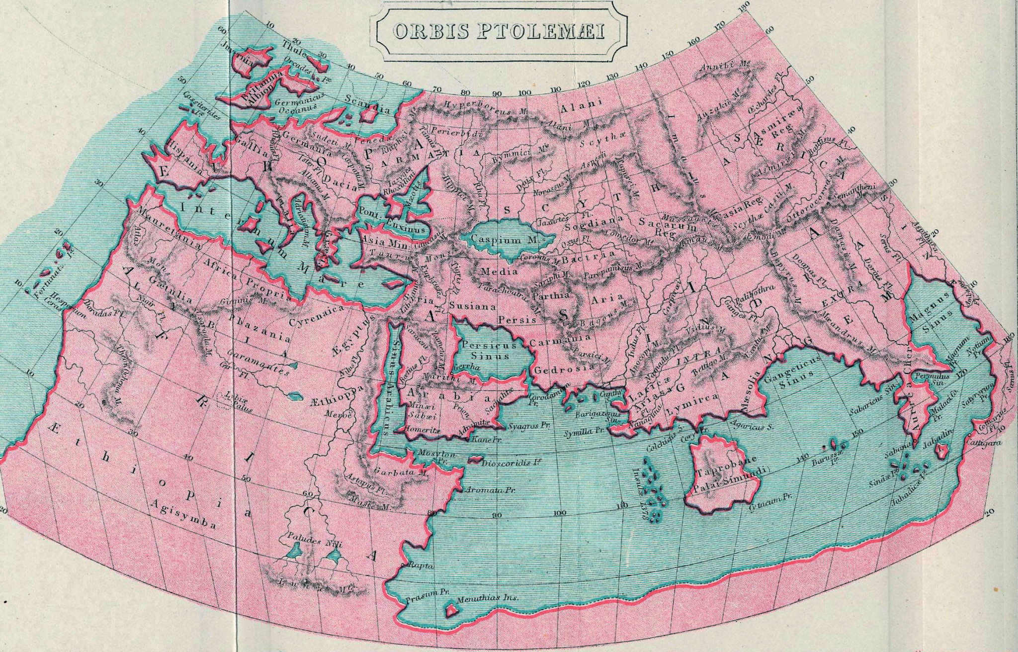 Какие координаты использовал Птолемей? Хорошо известные ныне широты и долготы. Конечно, Птолемей не знал про гринвичский меридиан и точкой отсчёта для долгот считал традиционно используемые и до него мифические острова Фортуны. Эти выдуманные острова были якобы расположены в Атлантическом океане. Удобство их использования заключалось в том, что они лежали западнее самой крайней точки известной в то время суши. Так что все долготы, отсчитываемые к востоку от этих островов, должны были иметь положительные значения. Как мы сейчас знаем, эти острова «лежали» примерно на 20 градусов западнее современного гринвичского меридиана, там, где находятся реальные Канарские острова.