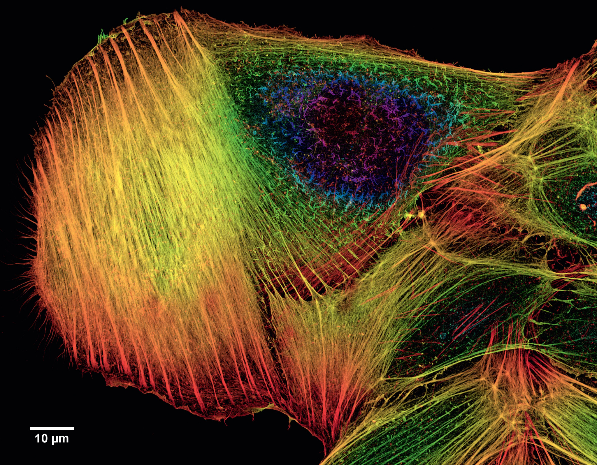 Микрофотография клетки остеосаркомы — одной из злокачественных опухолей кости. Фотография сделана с помощью конфокального флуоресцентного микроскопа. Цветные нити — это цитоскелетный белок актин. Его окрашивали фаллоидином, токсичным циклическим пептидом из бледной поганки. Фаллоидин специфически связывается с актиновыми нитями. Сам по себе фаллоидин не флуоресцирует. Чтобы он светился, к нему присоединяют небольшие флуоресцирующие молекулы.
