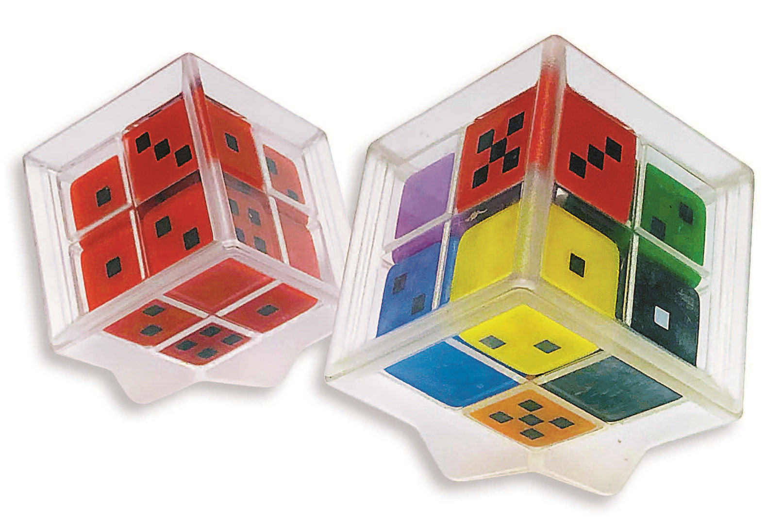 Внутри прозрачного куба 2 × 2 × 2 находятся 7 небольших кубиков. У каждого маленького кубика одна грань — пустая, на остальные нанесены от одной до пяти точек. Поскольку в большом кубе имеется 8 позиций, на которых могут находиться маленькие кубики, то одна из позиций будет пустой. Маленькие кубики перемещают, наклоняя большой куб в разные стороны, подобно тому, как в классической головоломке «Пятнашки» перемещают квадратики с цифрами. На большом кубе грани одного из углов закрашены красным цветом, образуя неподвижный красный кубик. На грани этого кубика нанесены одна, три и пять точек. Что можно делать с такой игрушкой? Оказалось, что это интересная и сложная головоломка. Перечислим задачи по мере возрастания их сложности от самой простой до самой сложной.