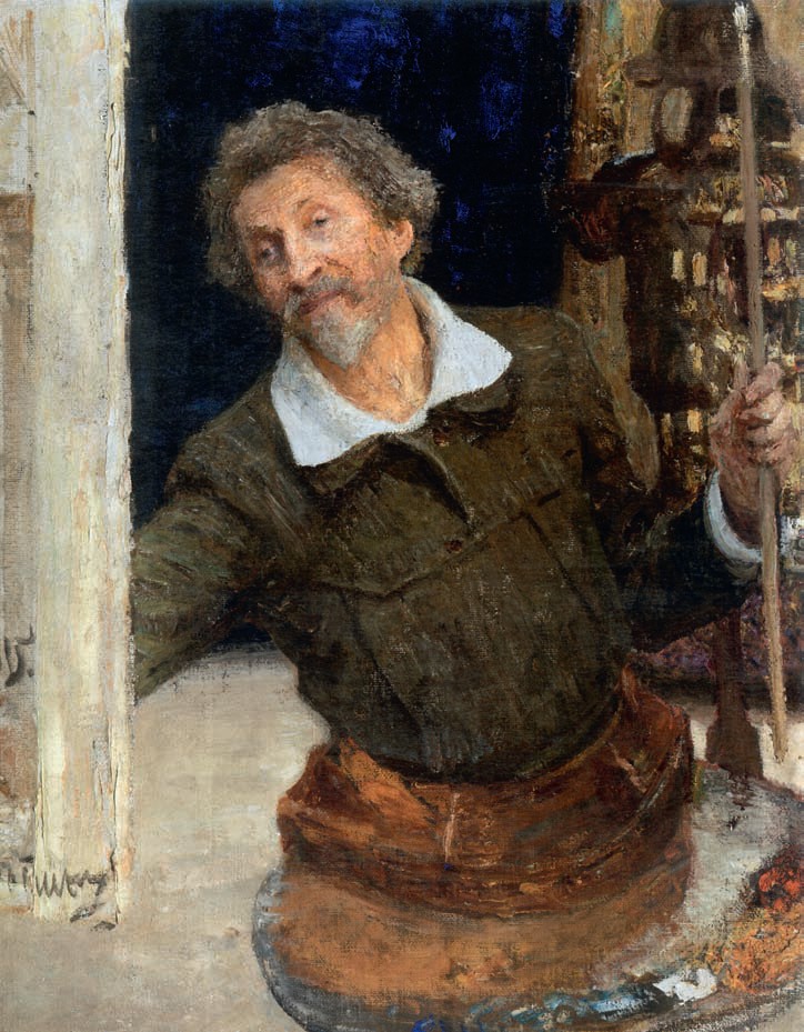 Автопортрет за работой. 1915 год. Холст, масло. Национальная галерея Праги. В начале 1900-х «врачи запретили Репину работать правой рукой. <...> Он принялся работать левой рукой. Чтобы совсем освободить больную руку от нагрузки, он заказал специальную палитру, прикрепляемую у пояса, и подставку для кистей, которую ставил вблизи себя. Одно время Илья Ефимович работал двумя руками: в каждой руке — по кисточке, а палитра — на поясе . Во время письма Репин весь уходил в работу. Он терпеть не мог, если ему кто-либо мешал», — вспоминал один из его учеников, художник Н. Я. Борисов.