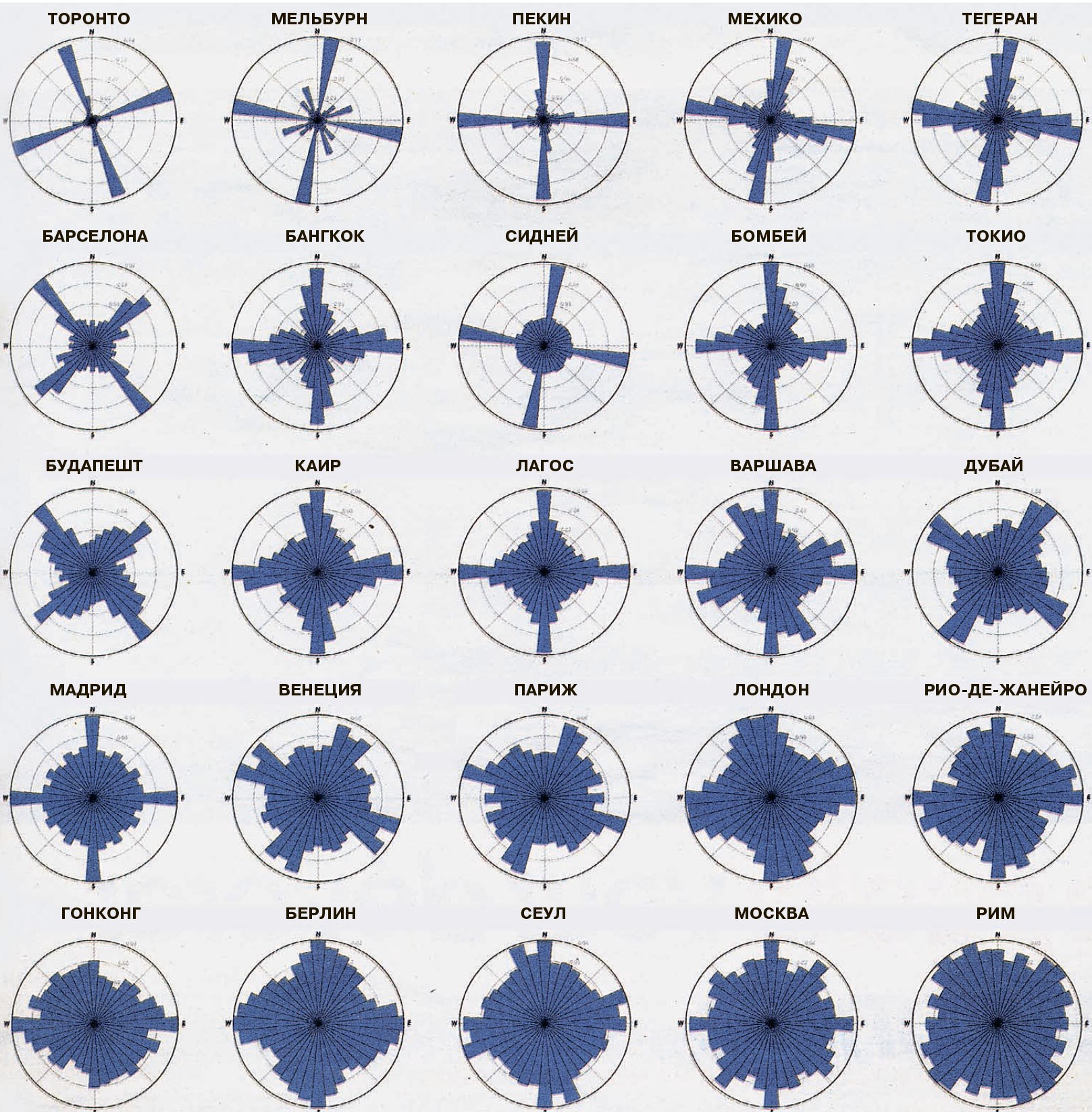 Американский картограф Джефф Боинг из Северо-Западного университета в Бостоне проанализировал преобладающую ориентацию улиц по странам света в сотне крупных городов мира. Оказывается, города можно рассортировать на строго ориентированные (Пекин или Варшава) и круговые, как Москва или Рим.