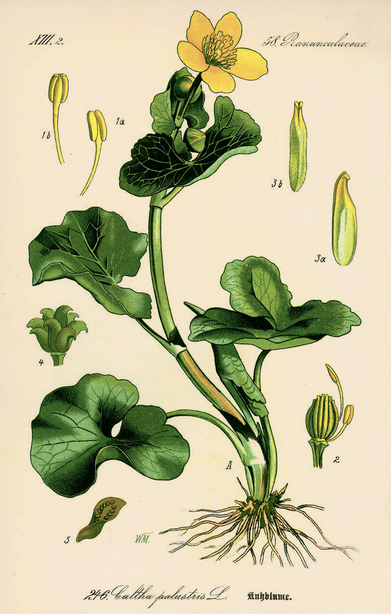 Вот, например, калужница болотная (Caltha palustris), травянистое многолетнее растение, с явными фамильными чертами семейства Лютиковые (Ranunculaceae). К концу апреля — началу мая берега ручьёв, канав и болот одеваются в золотистую оправу таких цветов, блещущих на ярком солнце. Разливы жёлтых лепестков держатся недели две, а затем растение-водолюб (даже имя его подмечает пристрастие к воде) исчезает. И особенно скоро, если места произрастания калужницы быстро обсохнут. Не пропустите момент, а я пока расскажу вам об этом растении.