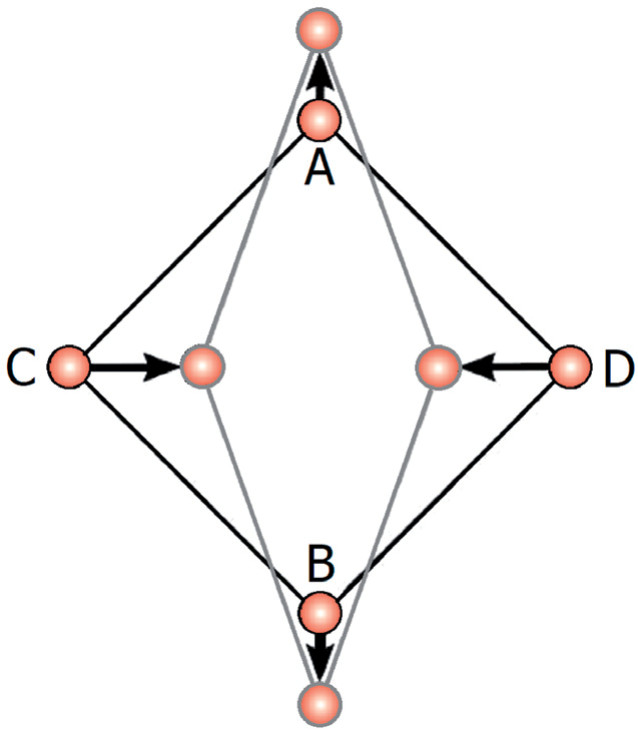 Шарнирная деформация ячейки кристаллической решётки. При расширении ячейки в направлении A—B произойдёт её сжатие в направлении C—D.
