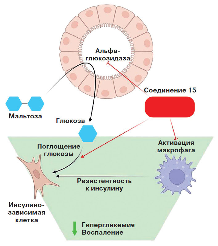 Диабет 2-го типа — сложное системное заболевание, затрагивающее массу биохимических процессов в организме. Есть разные подходы к лечению этого недуга. Один из них — подавление активности фермента α-глюкозидазы. Она синтезируется клетками кишечника, где помогает расщеплять сложные углеводы. Результаты работы α-глюкозидазы — молекулы глюкозы, легко всасывающиеся в кровь. Организм больных диабетом не может сам справиться с высоким уровнем глюкозы, что чревато серьёзными физиологическими проблемами. Больным можно помочь, подавляя активность α-глюкозидазы, — после еды глюкоза будет образовываться в кишечнике медленнее и медленнее станет поступать в кровь. Сейчас есть целый ряд лекарств, подавляющих α-глюкозидазу, но у всех у них есть свои недостатки, поэтому поиски новых ингибиторов продолжаются.