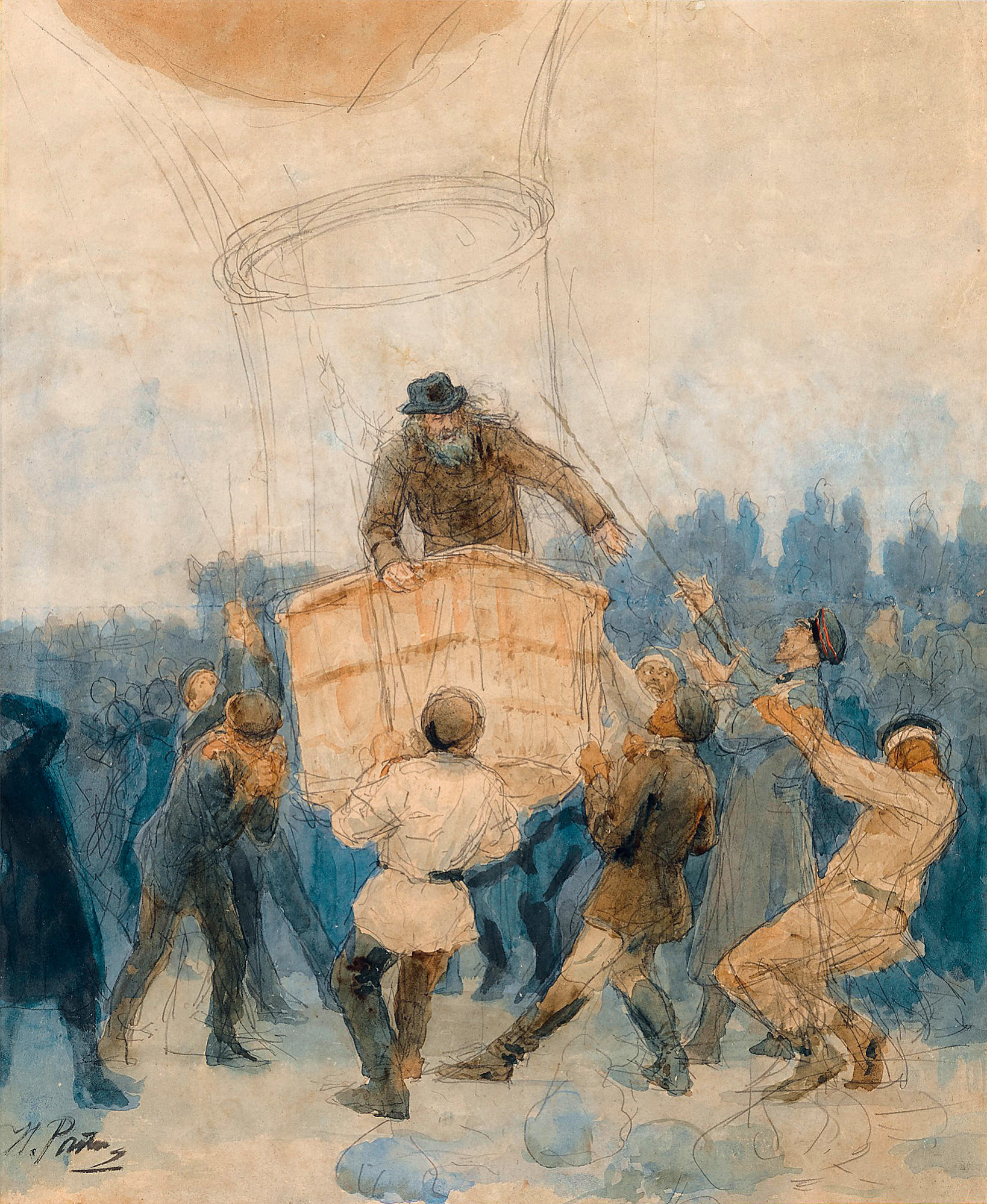 И. Е. Репин «Солнечное затмение в 1887 году» («Дмитрий Иванович Менделеев на аэростате»). 1887. Бумага, акварель, карандаш. Из коллекции Арманда Хаммера. Общественное достояние.