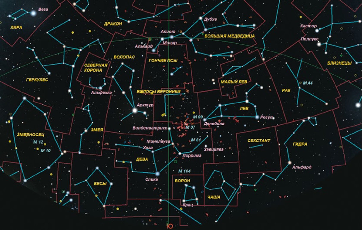 В весеннюю полночь на южной стороне московского неба, точно посередине между зенитом и горизонтом, располагается созвездие Девы. Над ним восточнее находится созвездие Волопаса, а западнее — созвездие Льва. Ниже можно обнаружить четырёхугольники созвездий Ворона и Весов. В апреле—мае в это время в зените находится Большая Медведица, которая в мае сдаст свою вахту Дракону.