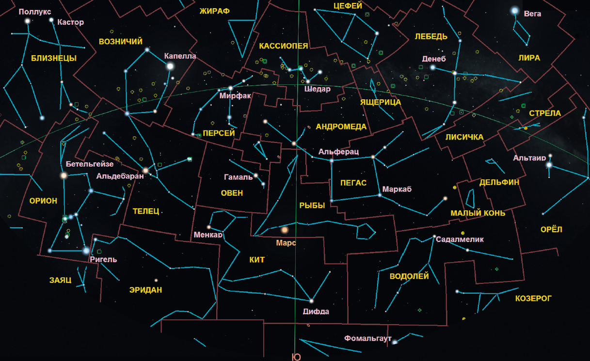 Осень — благоприятное время для наблюдения за группой известных с древности созвездий, названия которых связаны со знаменитым мифом о Персее. В нём Кассиопея, жена царя мифологической Эфиопии Цефея, вызвала гнев бога морей Посейдона похвальбой, что она (по другим версиям мифа — её дочь Андромеда) прекраснее морских божеств — нереид. Разгневанный Посейдон наслал на Эфиопию чудовище — Кита, спастись от которого можно было, только принеся ему в жертву Андромеду. Принцессу приковали к скале, оставив на растерзание Киту, но её спас Персей, прилетевший на Пегасе после победы над Медузой Горгоной. Затем, как и положено, он взял её замуж. Так они и разместились на небе рядом — созвездия Персея, Андромеды, Кассиопеи, Цефея, Пегаса и чуть поодаль Кита. Из других осенних созвездий стоит отметить созвездия Тельца, Овна и всё ещё находящегося на достаточной высоте Лебедя.