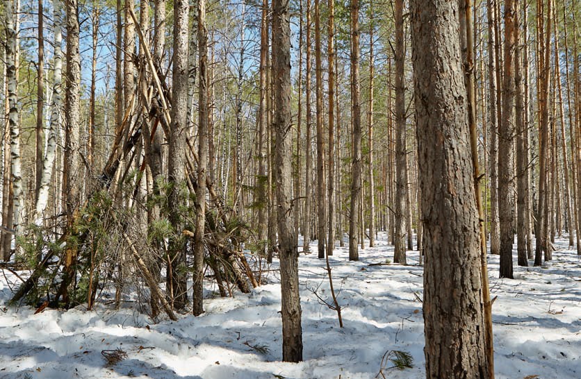 По сосновым побегам и веточкам, плотно набросанным на снегу, мы определили «кормовое» дерево. Сидя на высокой сосне, ближе к кроне, глухарь скусывал хвою сильным клювом, обильно посыпая иголками снег вокруг дерева. Но птиц оказалось две — на белом снежном фоне были хорошо видны их контрастные силуэты. Они, видимо, далеко и не уходили, с прошлой дождливой осени держались в чаще. Пока ягодники не накрыло белым одеялом, кормились по всей округе клюквой и брусникой, осиновым листом. Позже пригодилась мягкая хвоя лиственницы, а с приходом зимы — сосновая. Эти птицы, видимо, первыми проверяли старое «боевое» место. До схваток дело ещё не доходило, но звуки вылетали из горла самцов регулярно, оповещая конкурентов по всему лесу, что ток здесь. Глухари всё же нас заметили и не спеша ушли.
