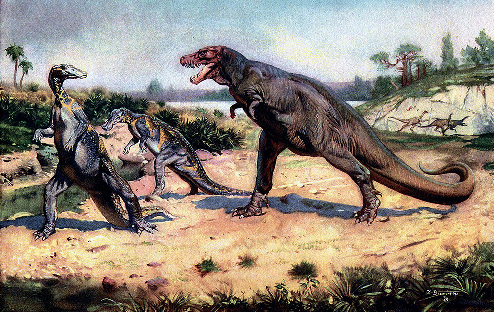 Тираннозавр и утконосые динозавры. Эта картина художника Зденека Буриана написана в 1938 году. В России она известна по книге: Аугуста Й., Буриан З. По путям развития жизни (1961). В свете сегодняшних представлений в изображённых на ней динозаврах неверно практически всё.
