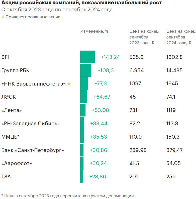 С конца сентября 2023-го по конец сентября 2024 года ситуация складывалась иначе: из 235 акций, отобранных для ранжирования, 196 бумаг упали в цене и только 39 — выросли. По сравнению с максимумом 2024 года, достигнутым 20 мая, по состоянию на 30 сентября индекс Мосбиржи снизился с отметки 3521,72 до 2857,56, на 18,9%.