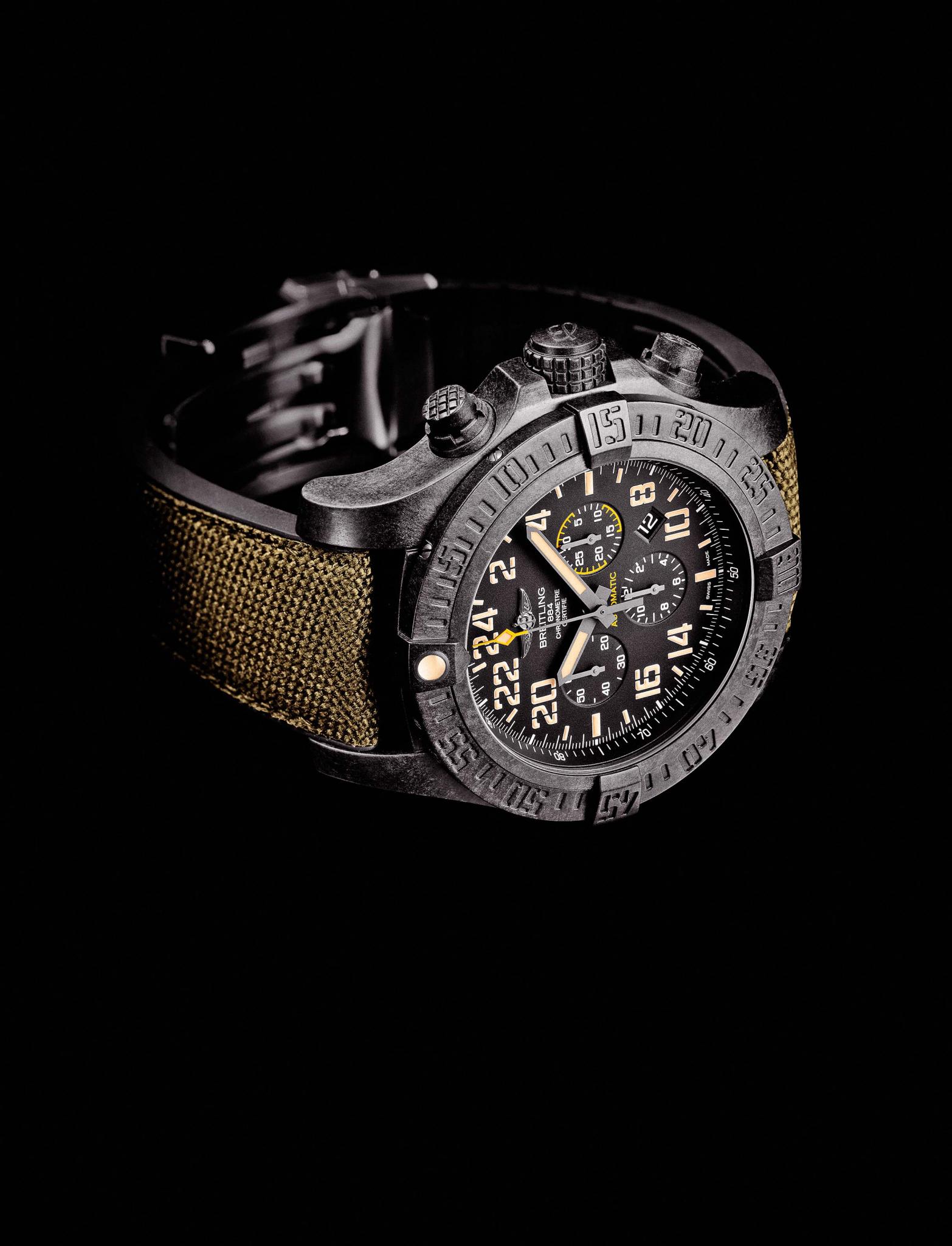 Год назад часовой бренд подарил любителям брутальных мужских хронографов исключительный функциональный инструмент для измерения времени Breitling Avenger Hurricane. Могучий, массивный на вид 50-миллиметровый корпус на самом деле оказался удивительно легким: вес часов вместе с ремешком не превышал 70 г. Все благодаря инновационному композитному материалу Breitlight — пластику, усиленному углеволокном. Он в 3,3 раза легче титана, в 5,8 раза легче стали и при этом исключительно устойчив к царапинам, коррозии, магнитным полям и резким перепадам температуры. Обновленная модель Avenger Hurricane Military также выпущена в корпусе из запатентованного композита Breitlight, в ней сохранили мануфактурный калибр B12 с функцией автоматического хронографа и «трафаретную» 24-часовую индикацию на черном циферблате Volcano. За стиль милитари отвечает ремешок из высокопрочного текстиля оттенка хаки на подкладке из черного каучука.