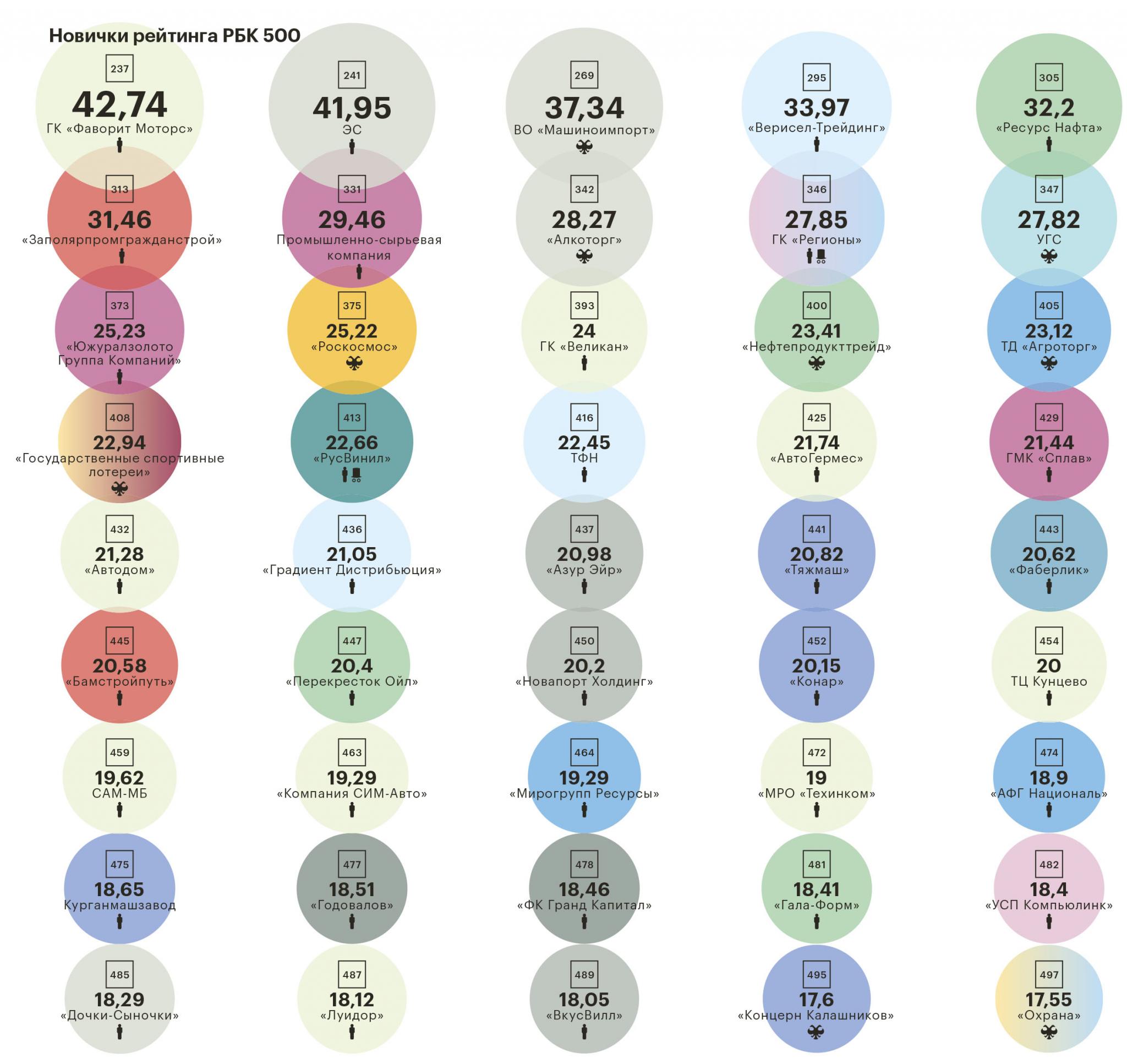 Часть новичков этого года должны были участвовать в прошлогоднем рейтинге — например автомобильные группы «Фаворит Моторс» и «Великан», но на момент закрытия рейтинга в распоряжении РБК не было финансовых данных по этим компаниям. Любопытно, что «Фаворит Моторс» и «Великан», а также «СИМ-Авто», «Луидор» и «Новапорт Холдинг» — «возвращенцы» в топ-500: все они входили в число крупнейших компаний рейтинга два года назад (по результатам деятельности в 2014 году).