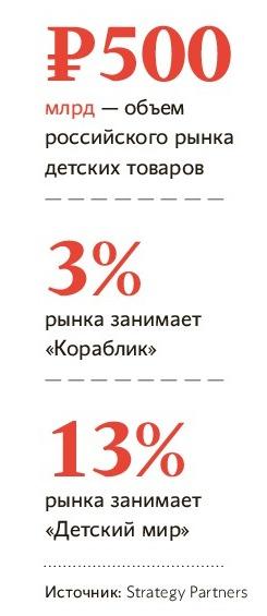 Сегодня объем российского рынка детских товаров составляет порядка 500 млрд руб., говорит партнер Strategy Partners Group Виталий Вавилов. «Детский мир» занимает 12–13%, доля «Кораблика» на рынке — порядка 3%, оценивает он. Пока доля «Детского мира» не выглядит доминирующей, так что возможности наращивания доли на рынке еще есть, уверен он.